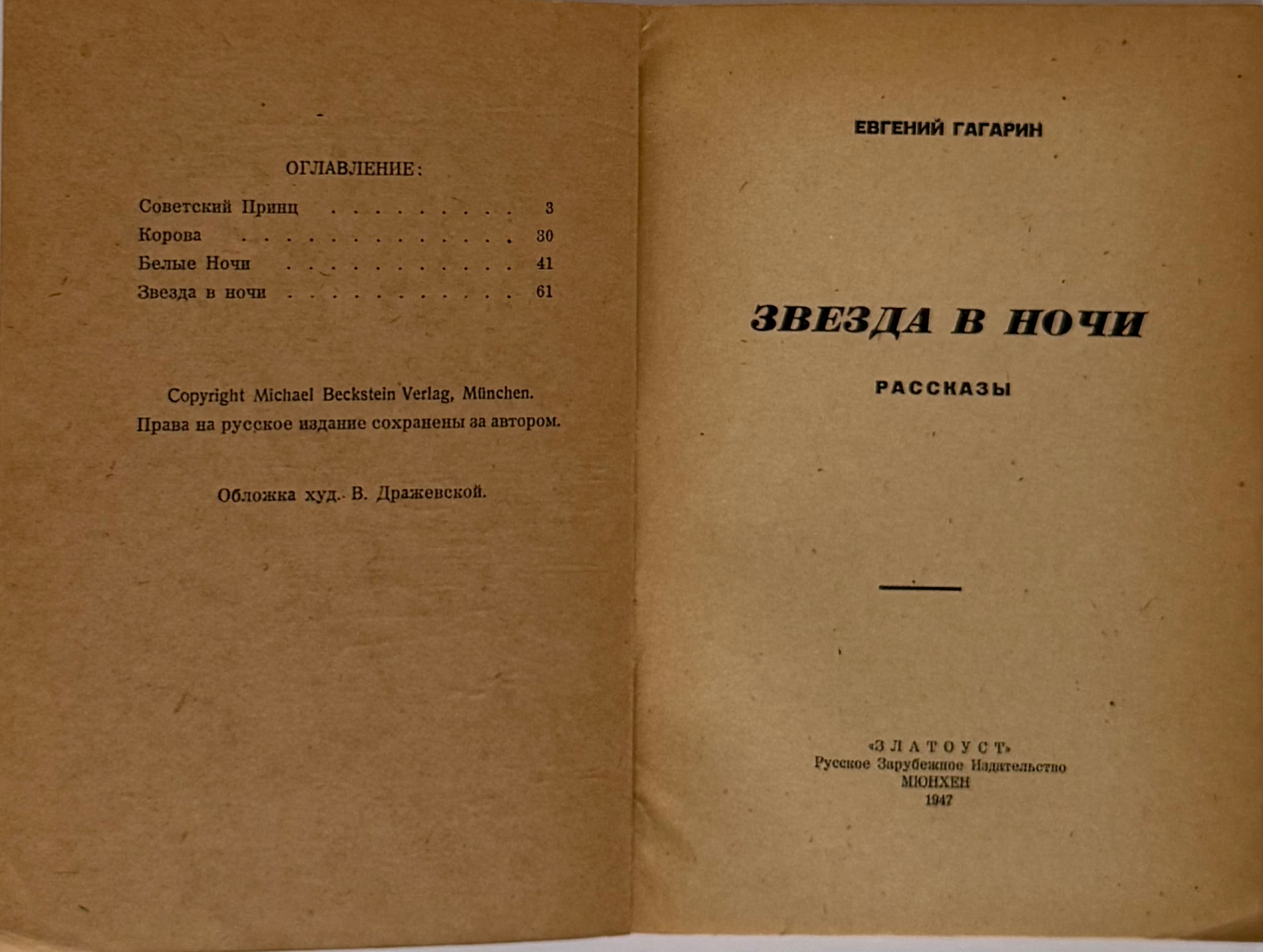 GAGARIN EVGENY (1905-1948) Zvezda v nochi: Rasskazy. [Star in the Night: Stories] Munich: Zlatoust, 1947.