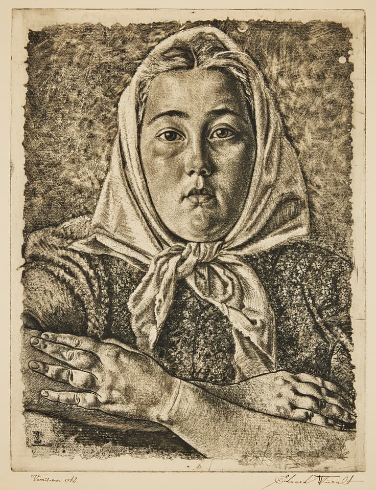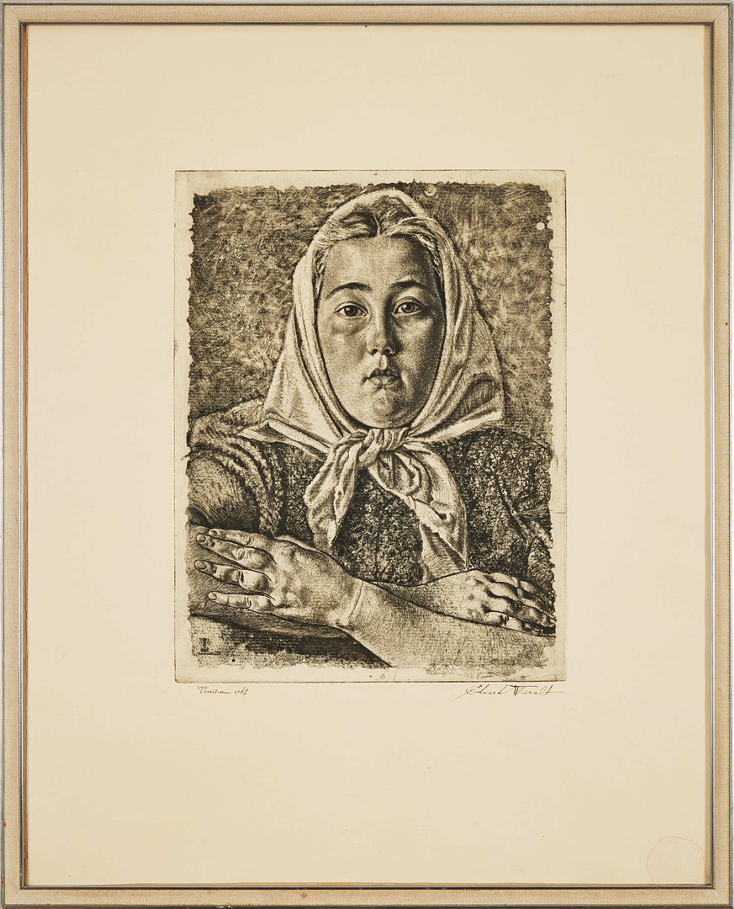 During the war-time in Estonia Wiiralt made mainly portraits, striving to express national character of the people. Ha has made a lot of drawings of a young lady, called Ada Sulling, but created on the basis of these drawings more generalized image of an Estonian woman in his portraits „Estonian Girl“ (1942, soft ground) and „Estonian Girl“ (1942, coloured aquatint). It is the image of a simple peasant woman, open and determined. The 2nd state of this work, made in Vienna (1944), is accomplished in the mixed technique of soft ground and dry point.