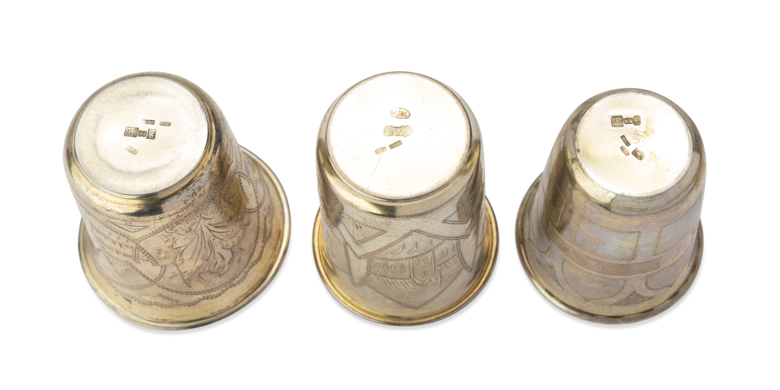 SET OF THREE RUSSIAN SILVER-GILT BEAKERS/ VODKA GLASSES, LATE 19TH CENTURY