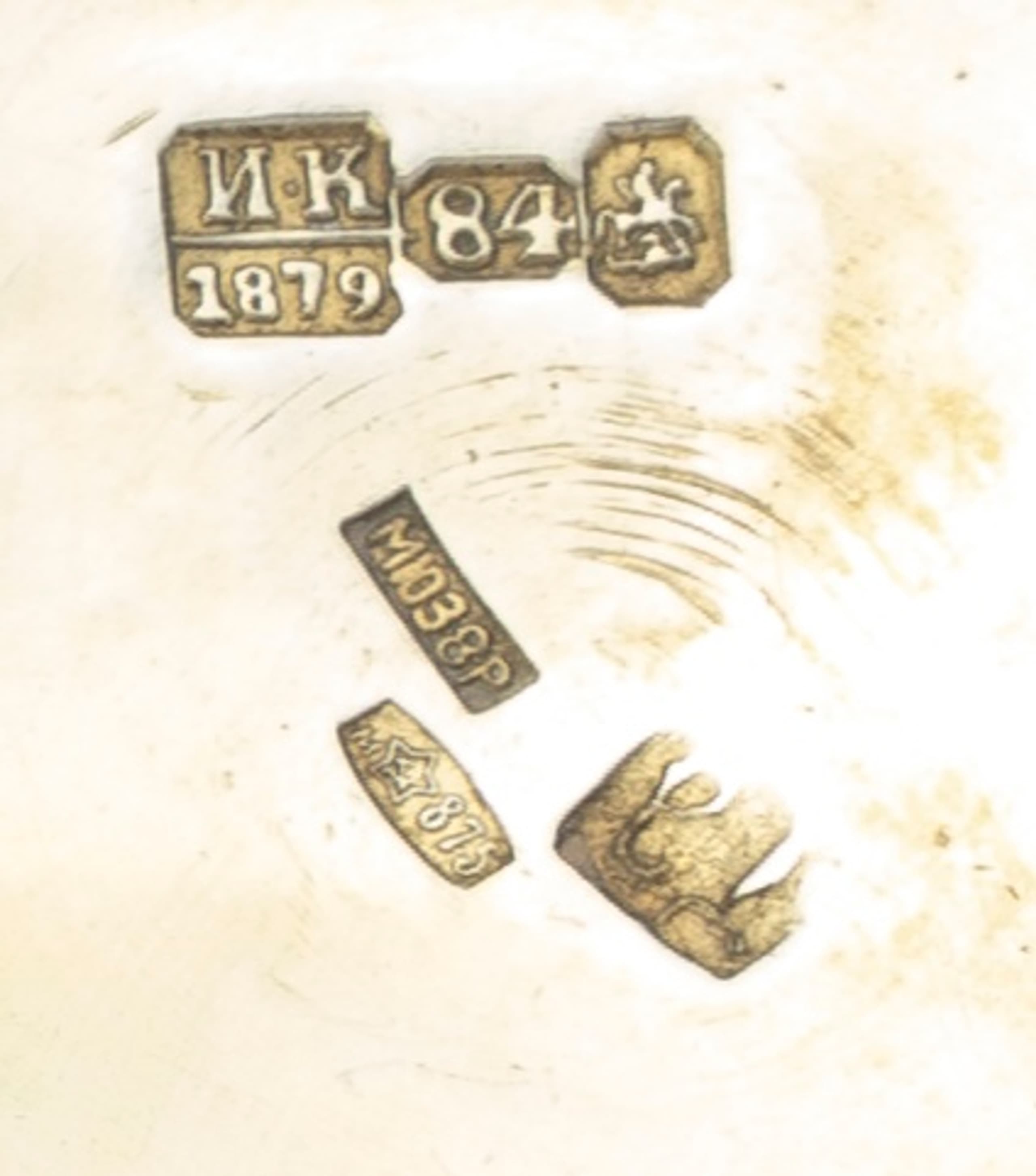 Hallmarks: silver standard marks ‘84’, master’s mark in Cyrillic, assay master’s mark in Cyrillic ‘I.K’ above the date ‘1879’, arms of Moscow city’ St. George’, retesting mark of Moscow Jewellery Zavod in 1968 ‘MIU3R8’ and ‘star 875’