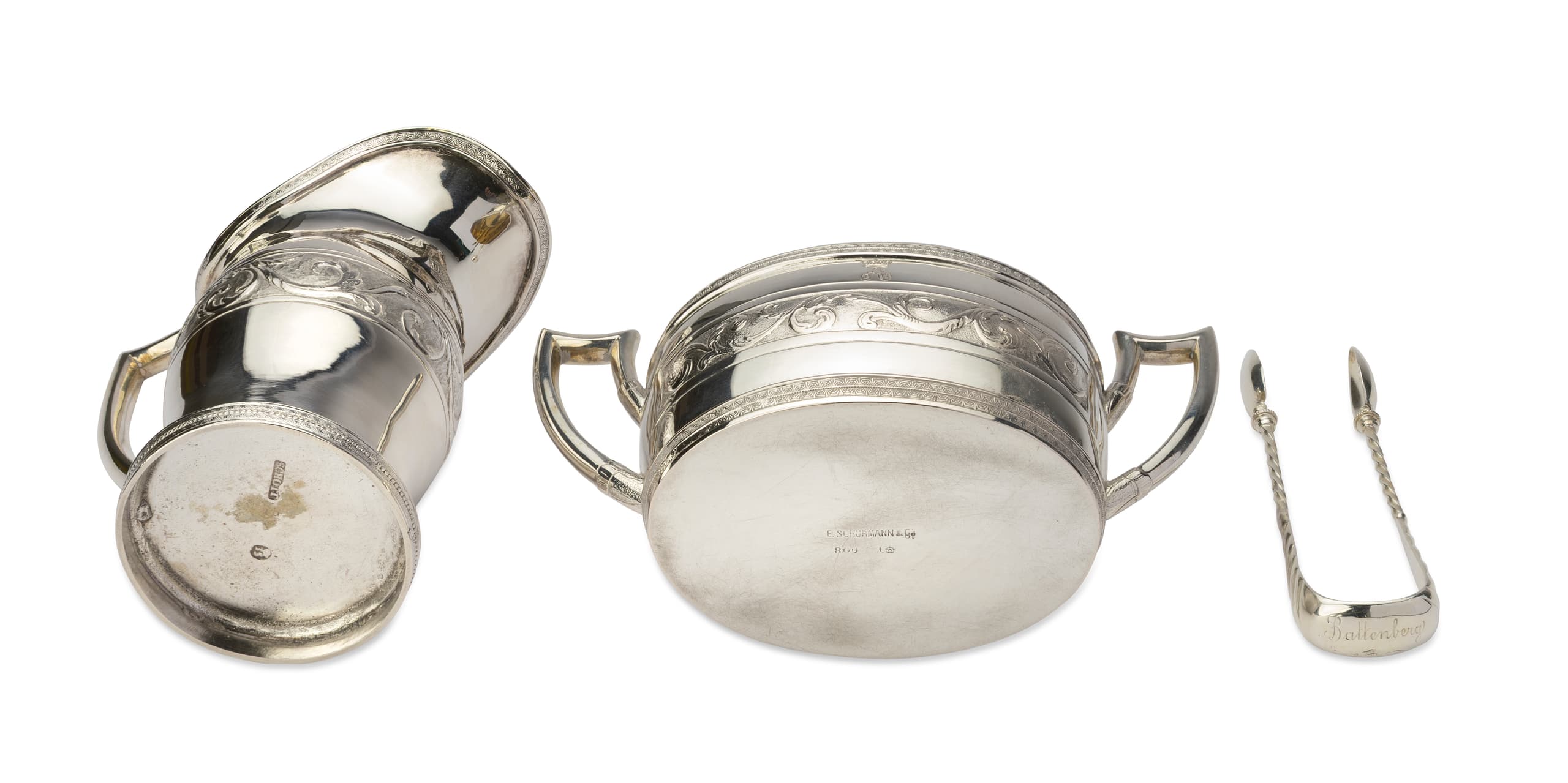 [FROM THE ESTATE OF ELIZAVETA DEMIDOVA-OBOLENSKAYA] STERLING SILVER-GILT MILK JUG, SUGAR BOWL AND TONGS E. SCHÜRMANN & CO, THE SECOND HALF OF THE 19TH CENTURY. Jug engraved with a monogram ‘A’ under an Imperial crown, tongs engraved with ‘Battenberg’