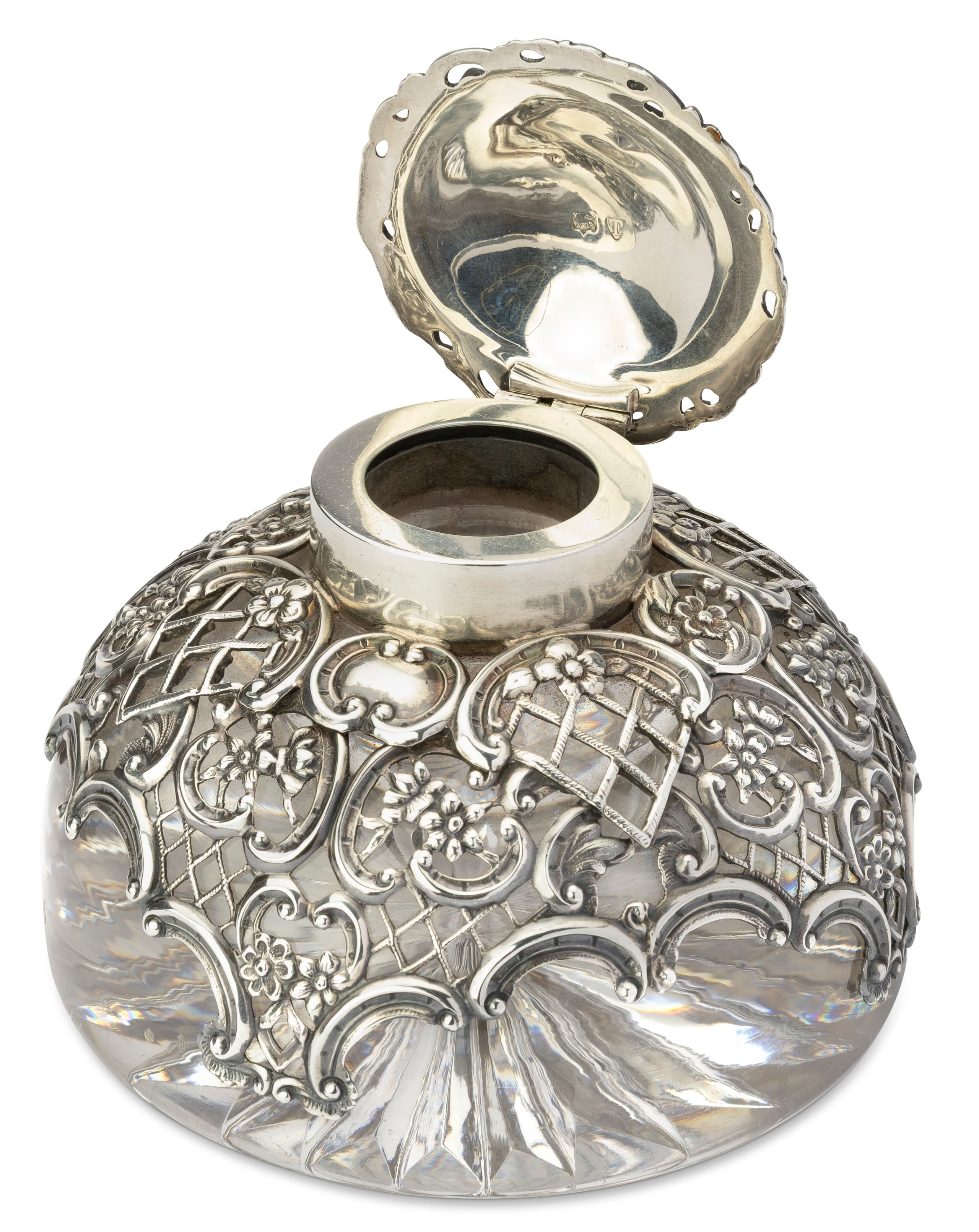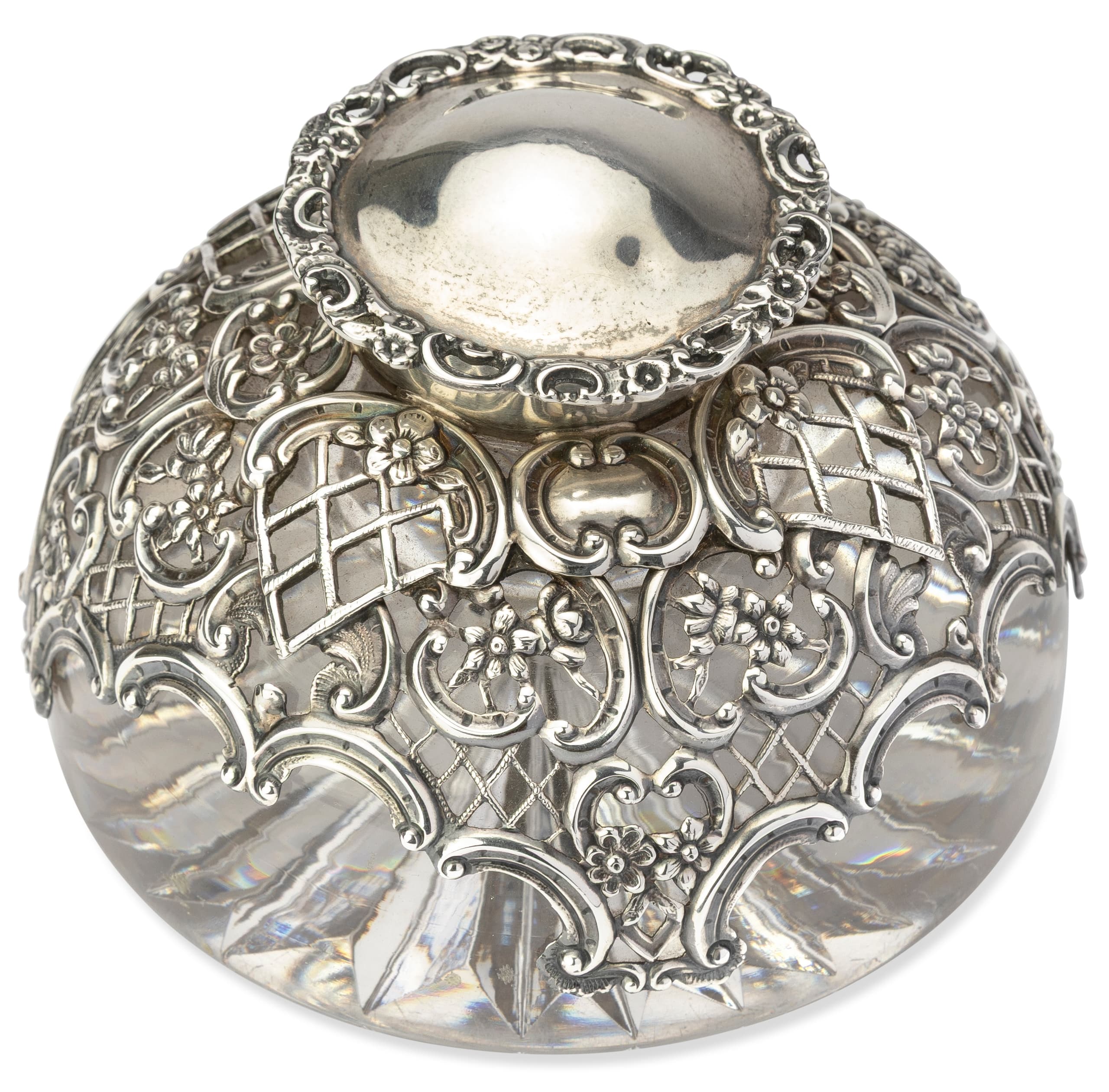 [FROM THE ESTATE OF ELIZAVETA DEMIDOVA-OBOLENSKAYA] VICTORIAN STERLING SILVER AND CARVED CRYSTAL INKWELL Mark of William Comyns, London, 1894