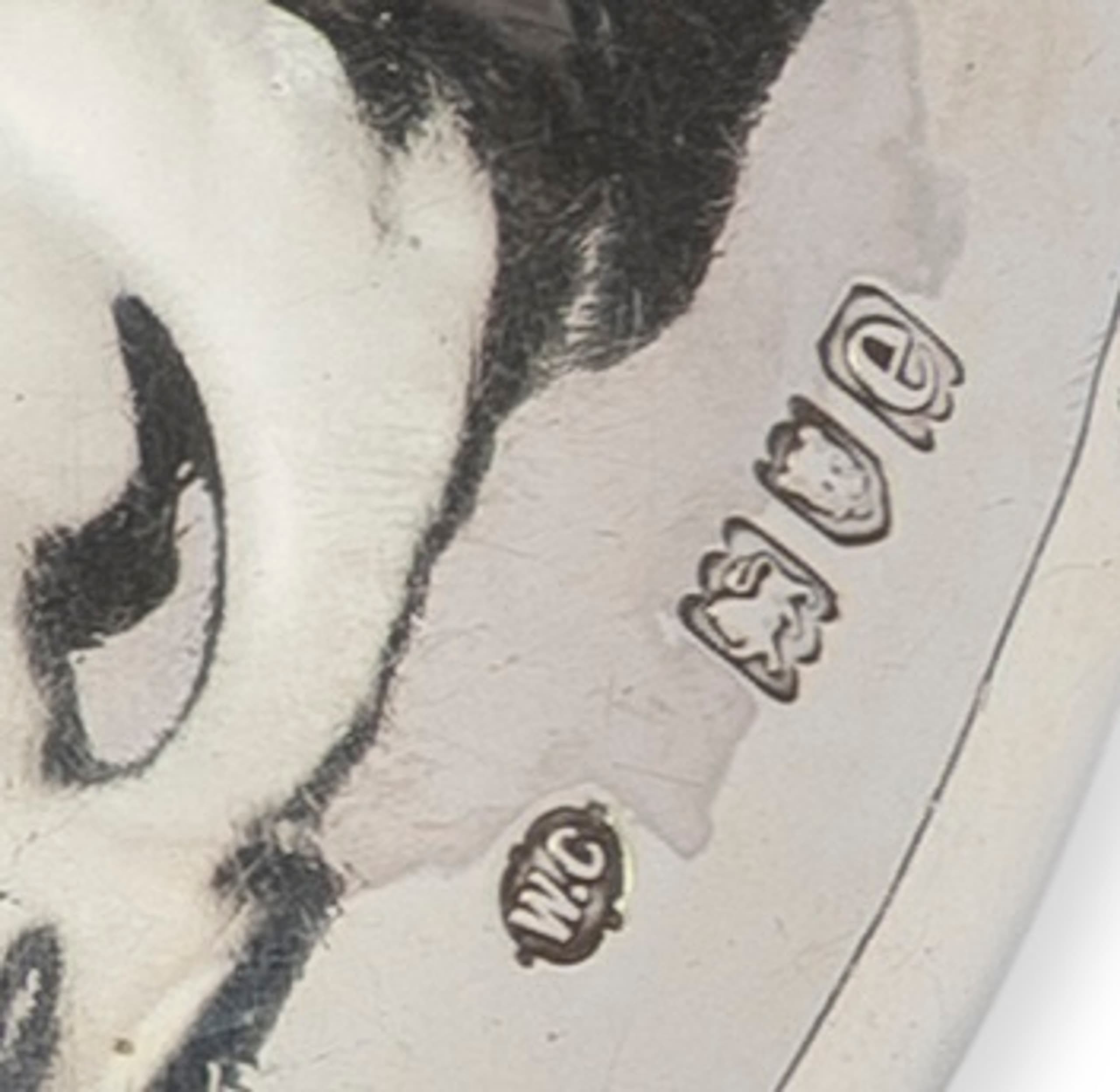 Hallmarks: lion passant, leopard’s head, year mark ‘e’, ‘a’, maker’s mark ‘W.C’, English sterling silver with maker’s mark ‘WO’, ‘lion passant’ (925 standard), ‘leopard’s head’ for London assay office, date letter ‘a’.