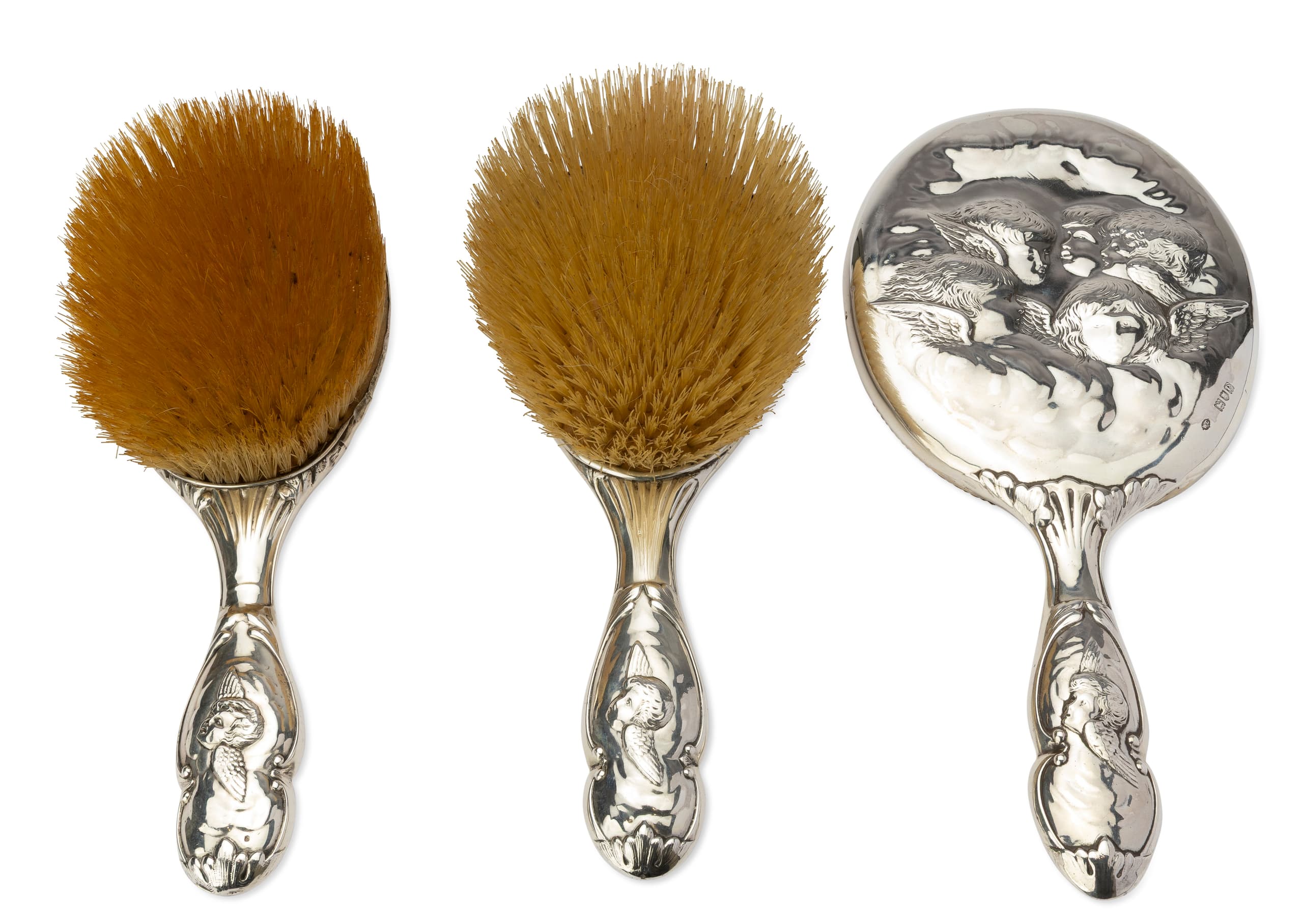 [FROM THE ESTATE OF ELIZAVETA DEMIDOVA-OBOLENSKAYA] STERLING SILVER DRESSING TABLE SET COMPRISING TWO BRUSHES AND A MIRROR Including Mark of William Comyns, London, 1896-1900