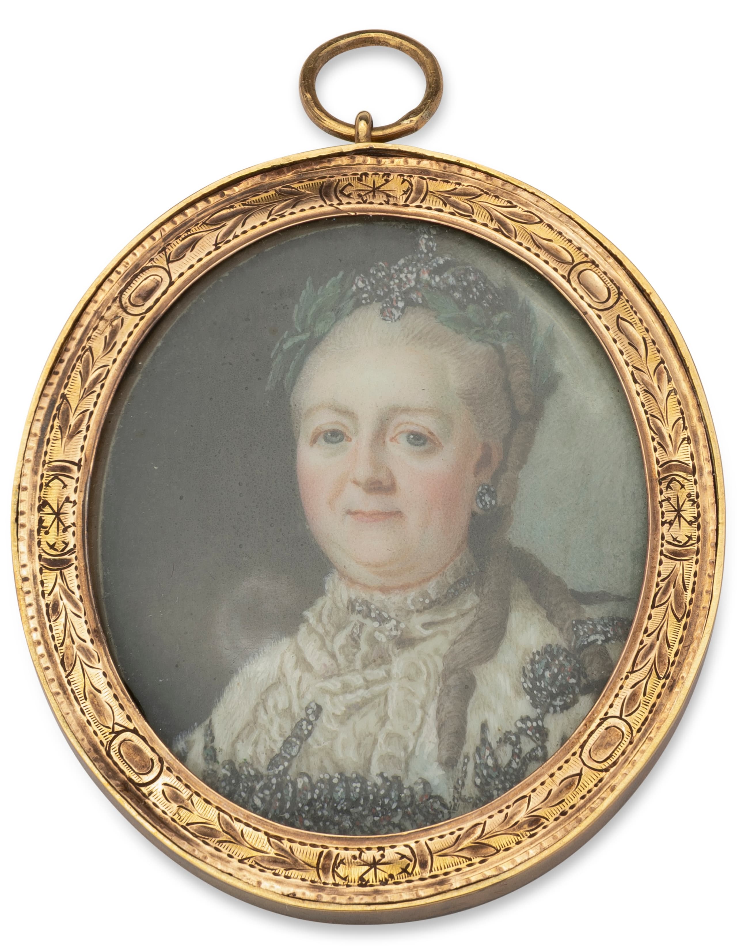 depicting the Empress Catherine the Great within an oval rame with engraved decoration watercolour 5.5 x 4.5 cm