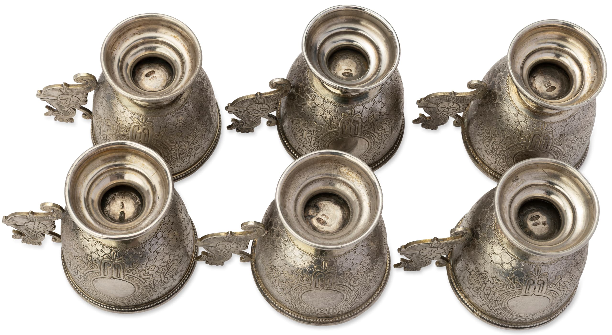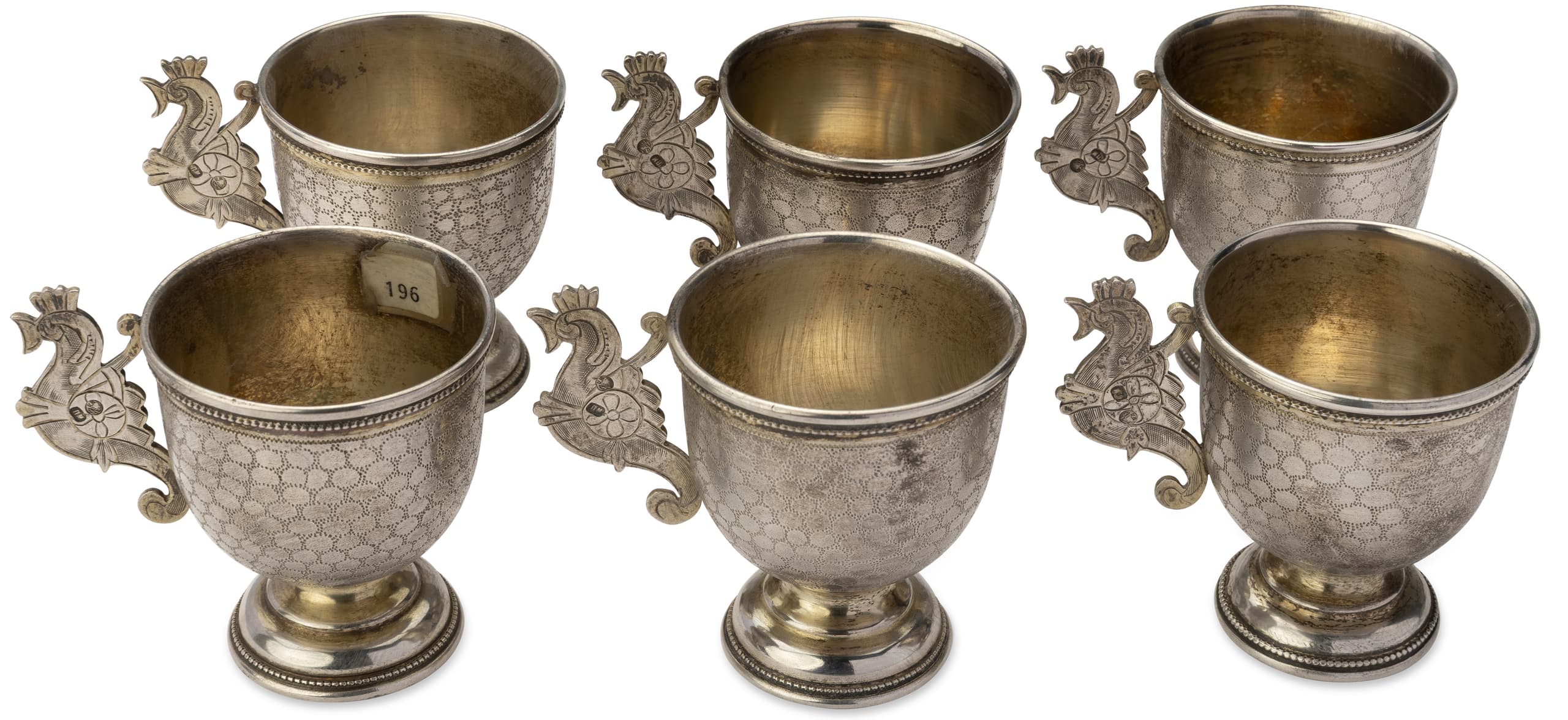 SET OF SIX RUSSIAN SILVER CUPS WITH HANDLES MODELLED AS SEAHORSES Maker Petr Milyukov, Moscow, 1899–1908