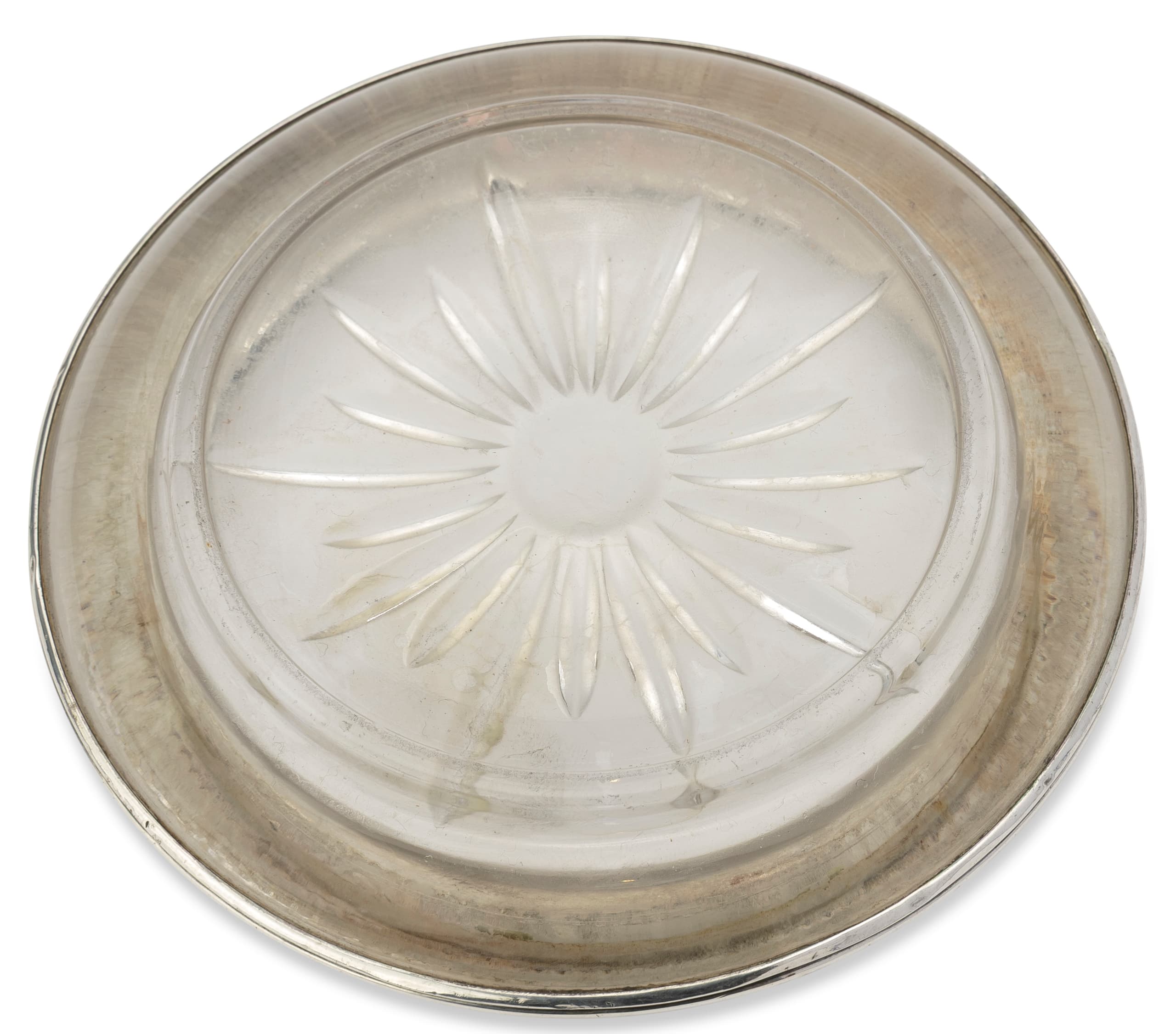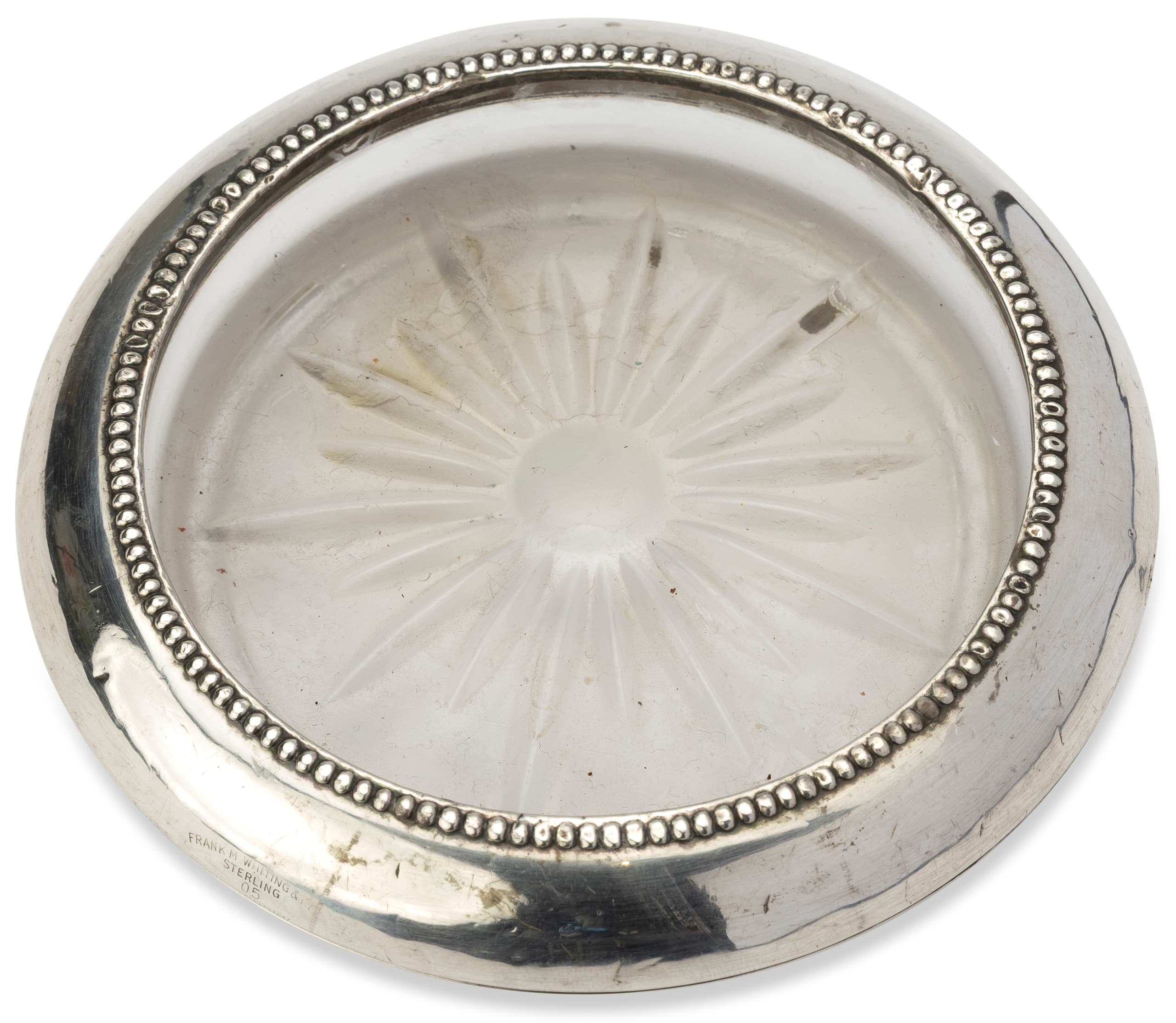 FRANK M WHITING & CO STERLING SILVER AND CRYSTAL ASHTRAY/ COASTER, CIRCA 1900–1940