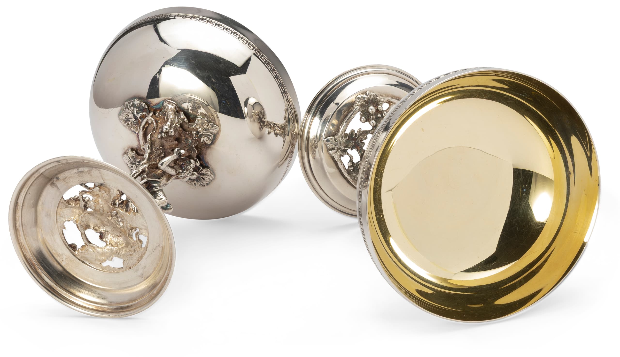 figured of Bacchus holding gold-washed coupe on round base with filigree grape leaf designs
