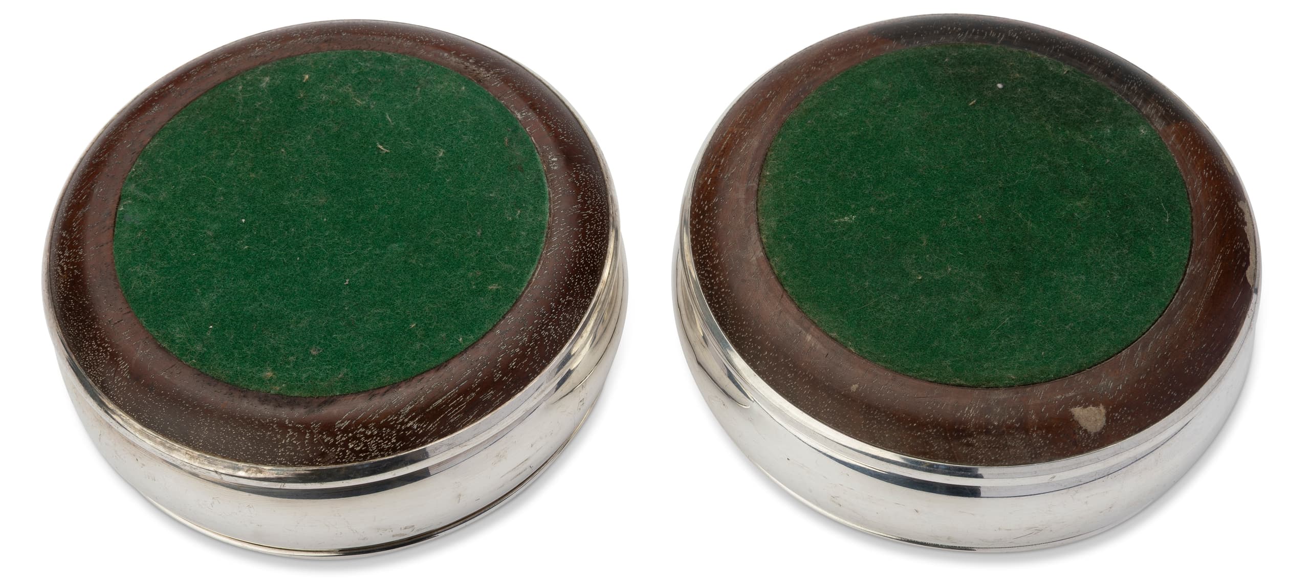 PAIR OF SILVER-PLATED AND WOOD WINE BOTTLE COASTER WITH BAIZE BASE