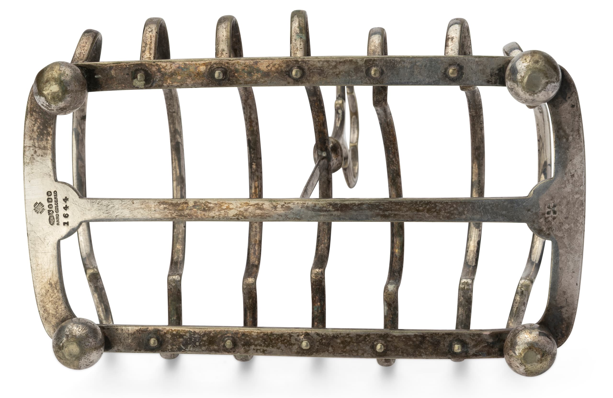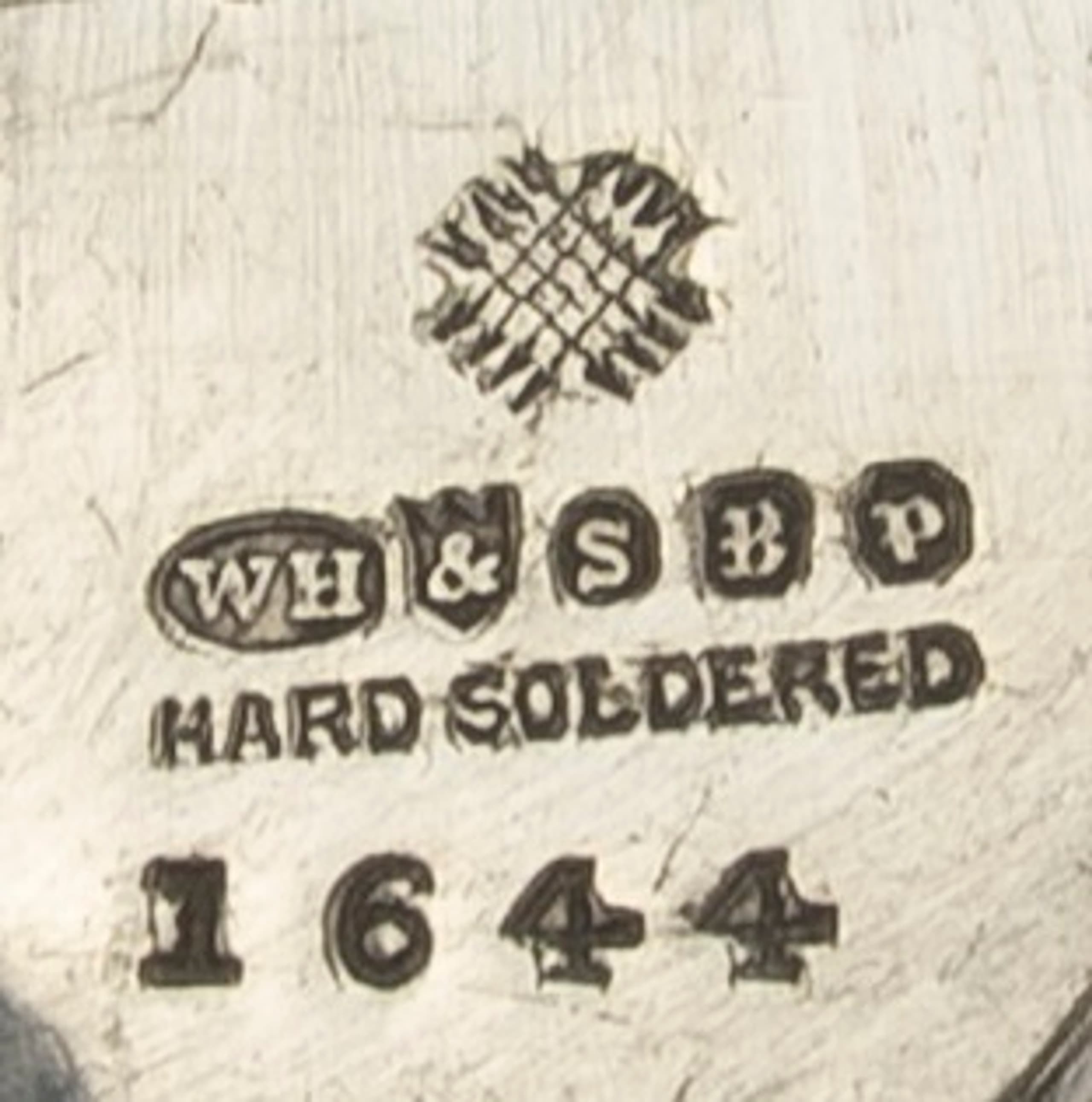 Mark: ‘WH’ (probably for the renowned British firm William Hutton & Sons, active c. 1800–1938, renowned for the high quality of their silver-plated metal), ‘Hard Soldered’ (parts of the object have been joined by silver soldering)