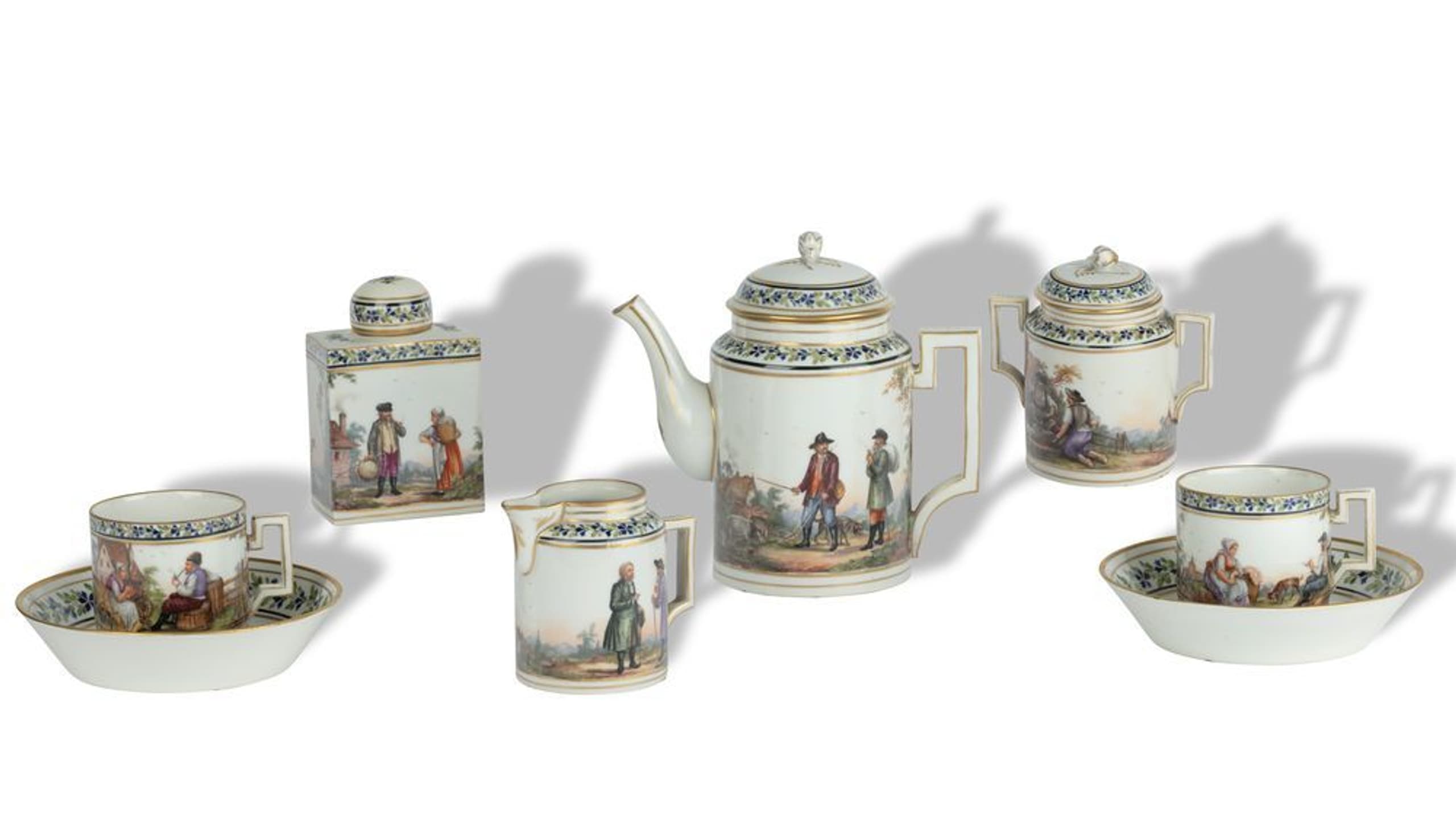 Imperial Neo Classical style service decorated with pastoral scenes, intertwining of blue cornflowers and leaves, gilded rims and lids, and with gilded hazelnut as finial