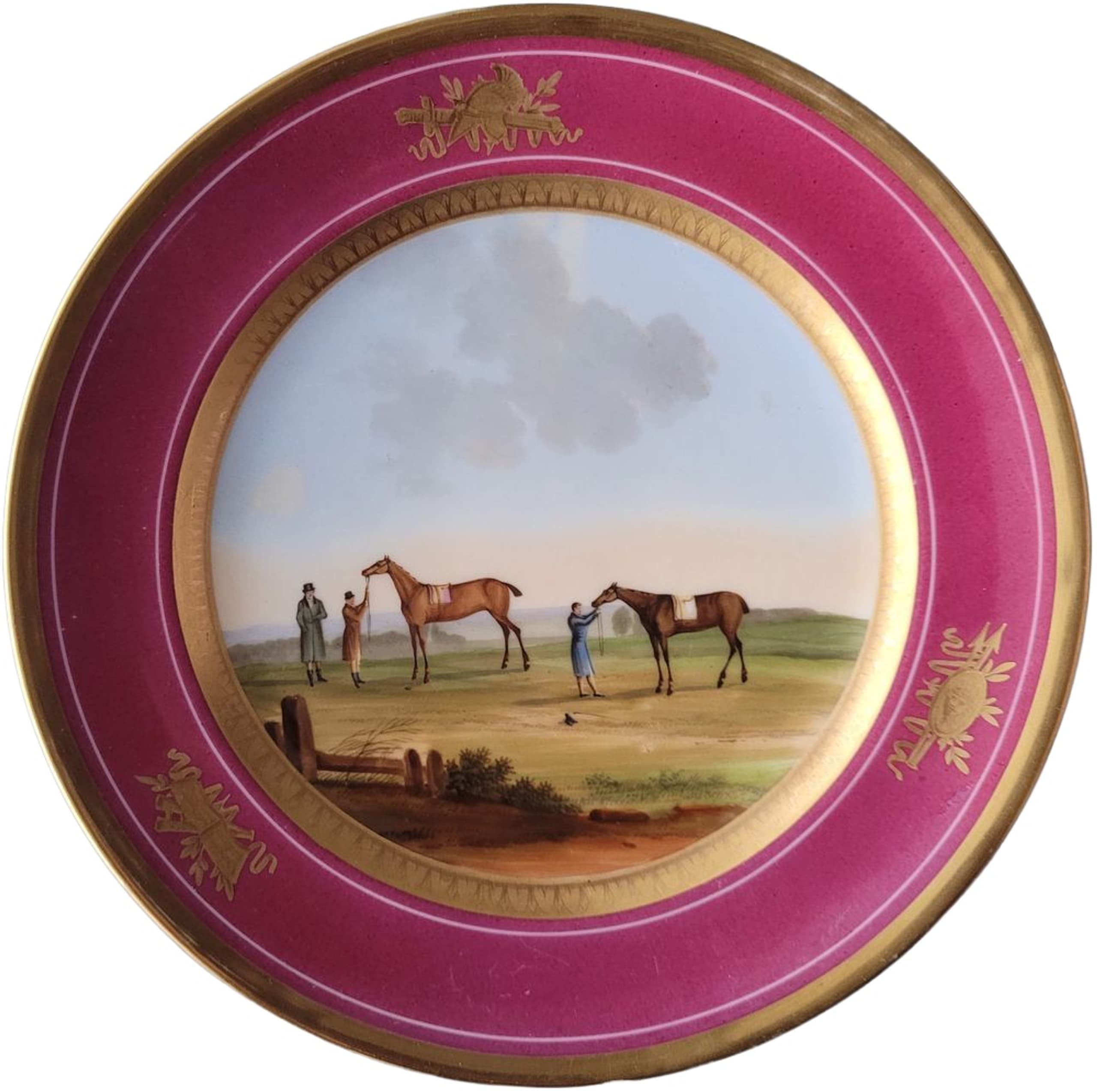 Painted with a scene of three gentlemen and two horses, within