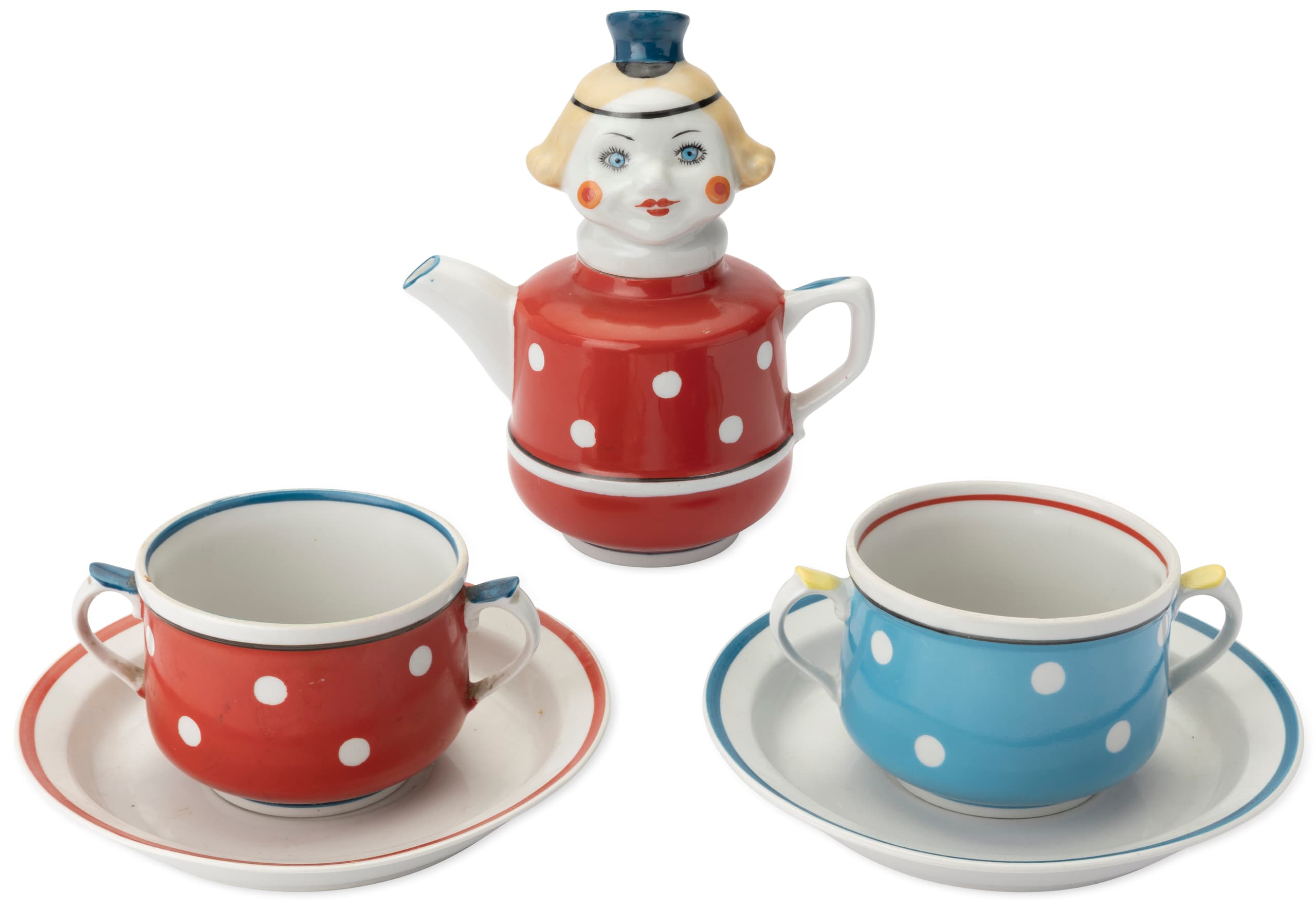 SOVIET PORCELAIN TEA SET WITH TEAPOT AND TWO CUPS AND SAUCERS Korosten, mid-20th century