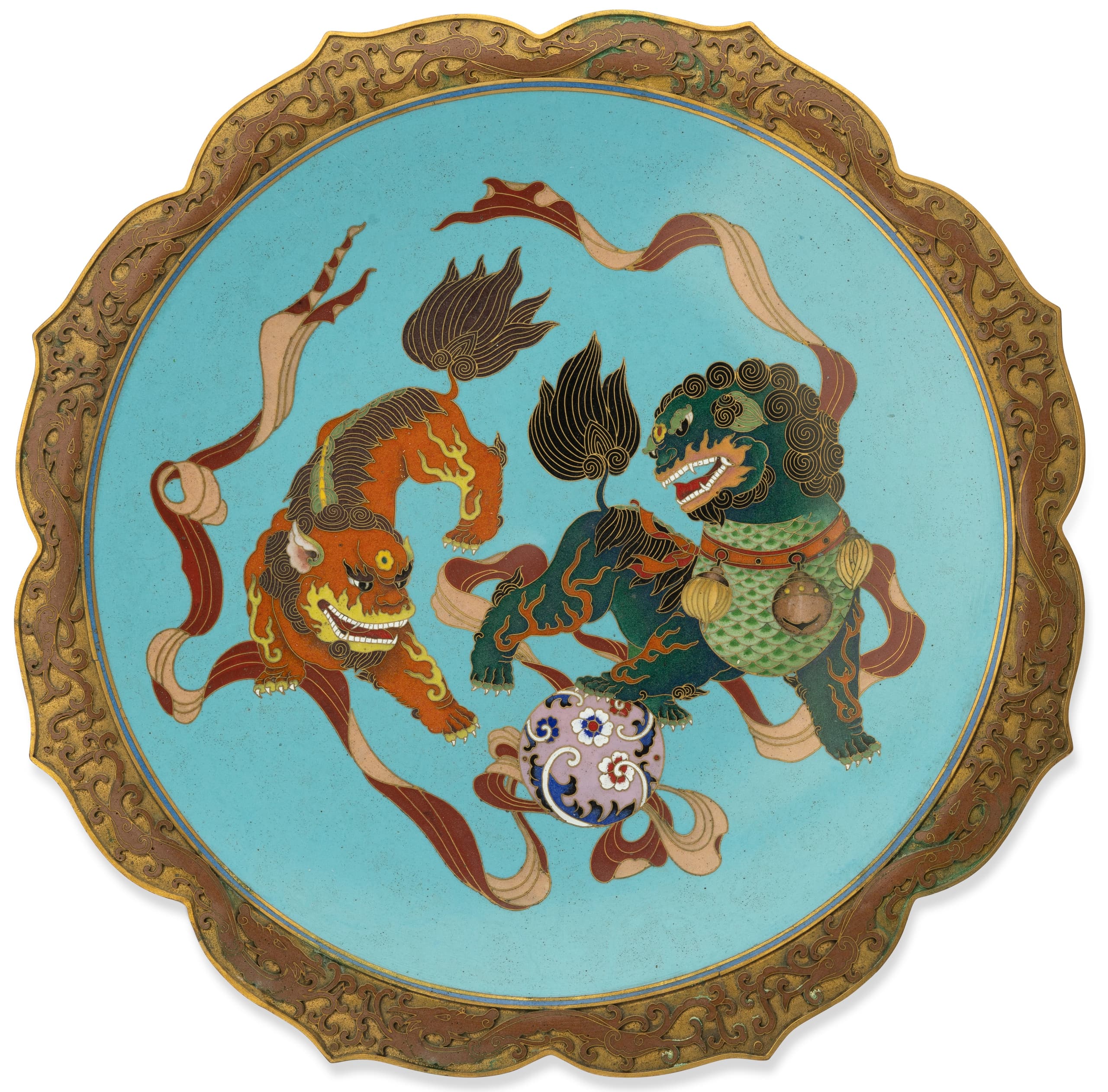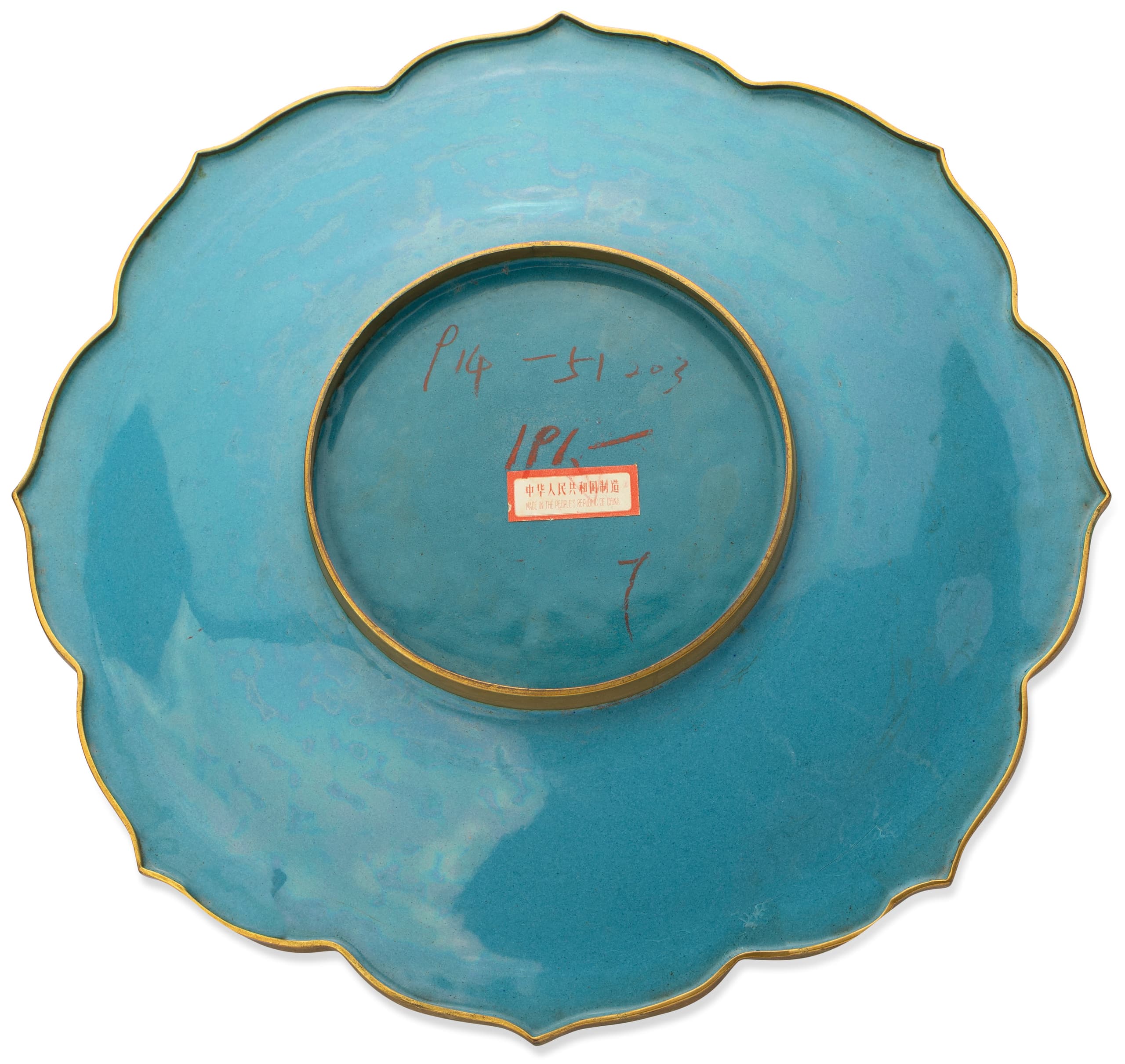 decorated with two Fô Lions (guardian lions) playing with a flaming pearl adorned with ribbons on the turquoise background. In Chinese culture, this motif symbolises protection, positive energy and good fortune. The gilded rim features stylised clouds, a common motif in imperial decorative arts.