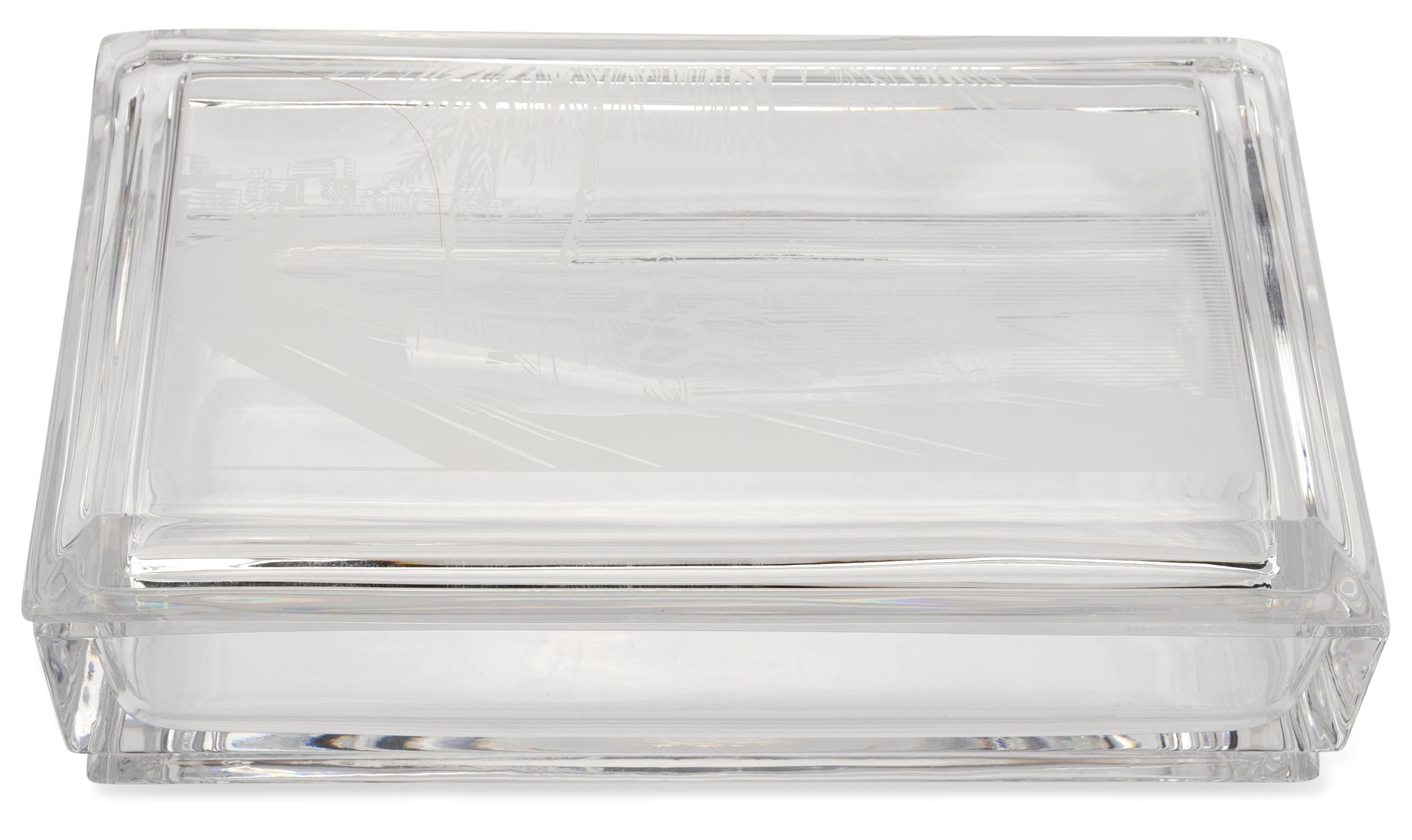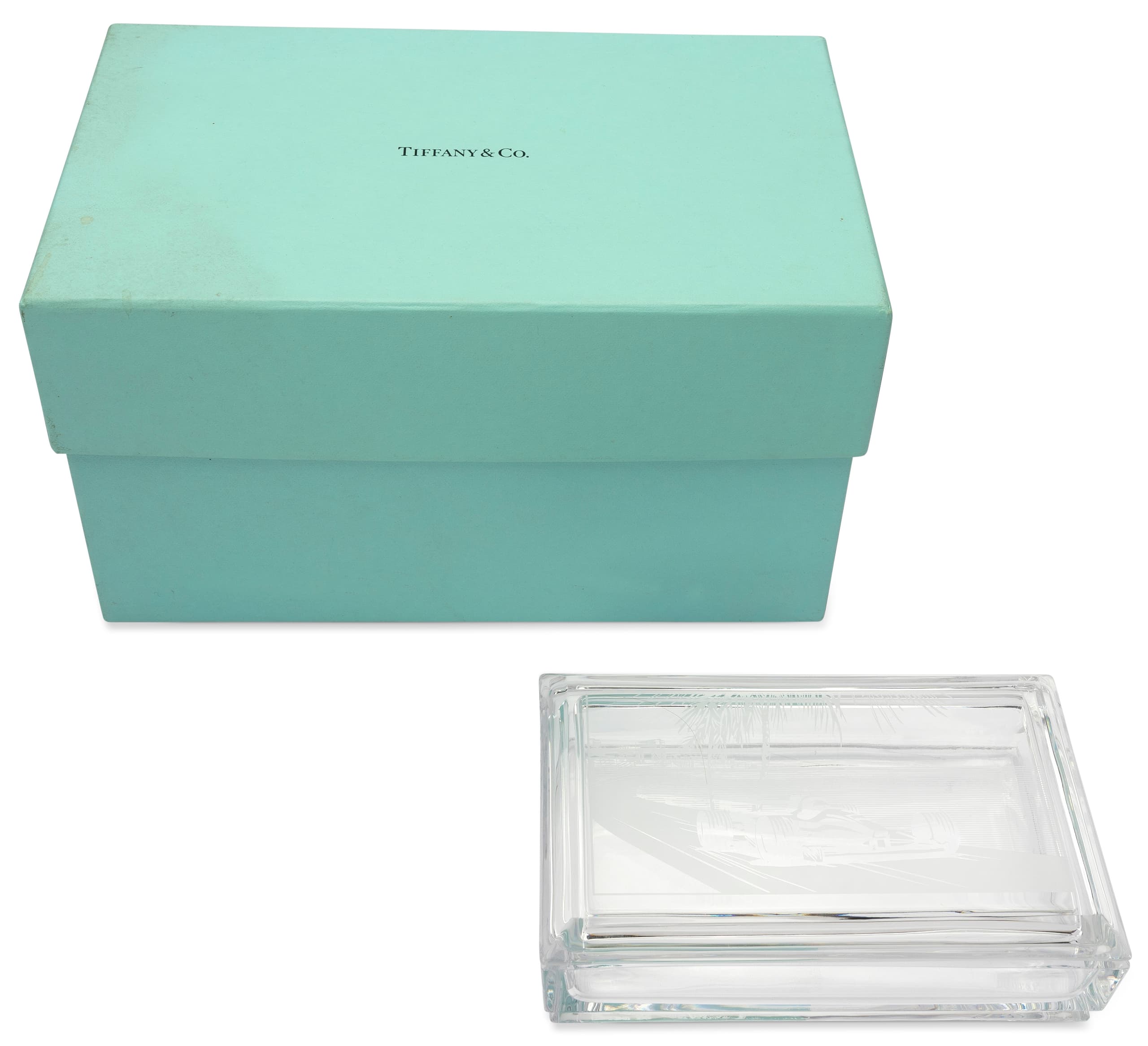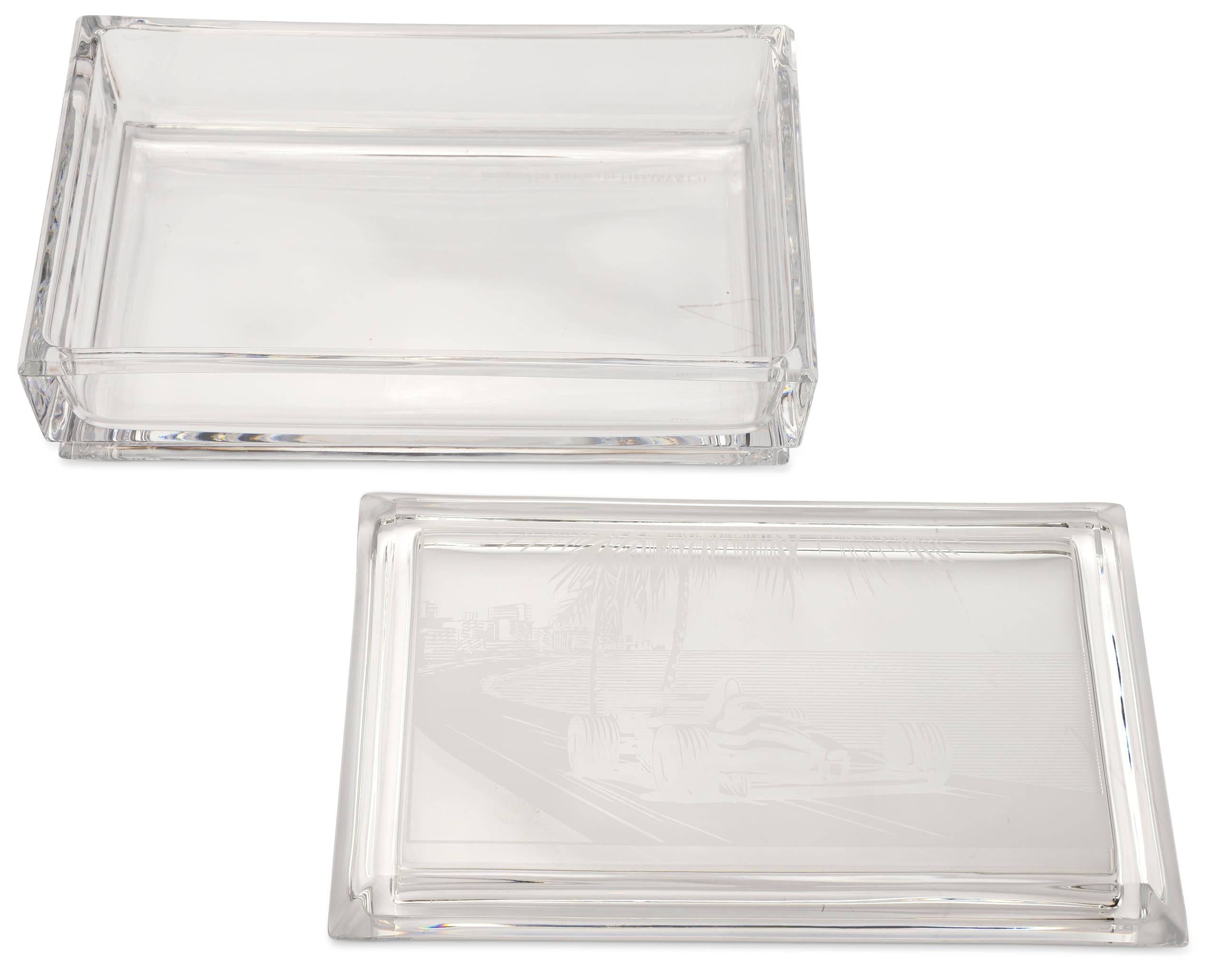 rectangular crystal box with a lid engraved with a scene from the Monaco Grand Prix featuring a Formula 1 car