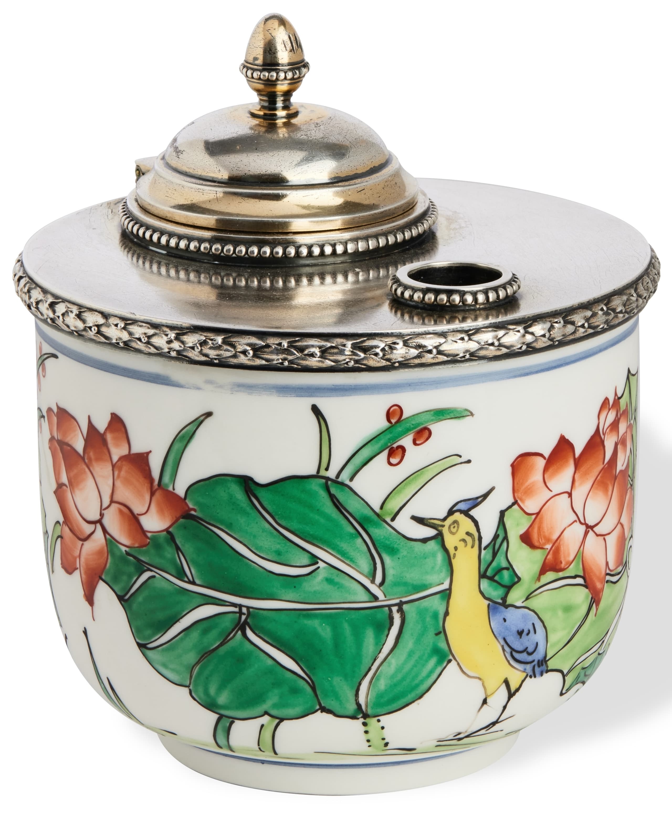 Circular porcelain bowl holding a round silver lid with an opening on one side surrounded by a beaded border to hold the pen and a round inkwell with a hinged lid topped by a pinecone on the other side also surrounded by a beaded border. The side of the lid is decorated with a wreath or circular garland of laurel leaves engraved in etching. The inkwell has a removable glass crucible. The porcelain is decorated with birds among foliage and flowers. Traces of gilding on the inside of the lid and around the ink opening.