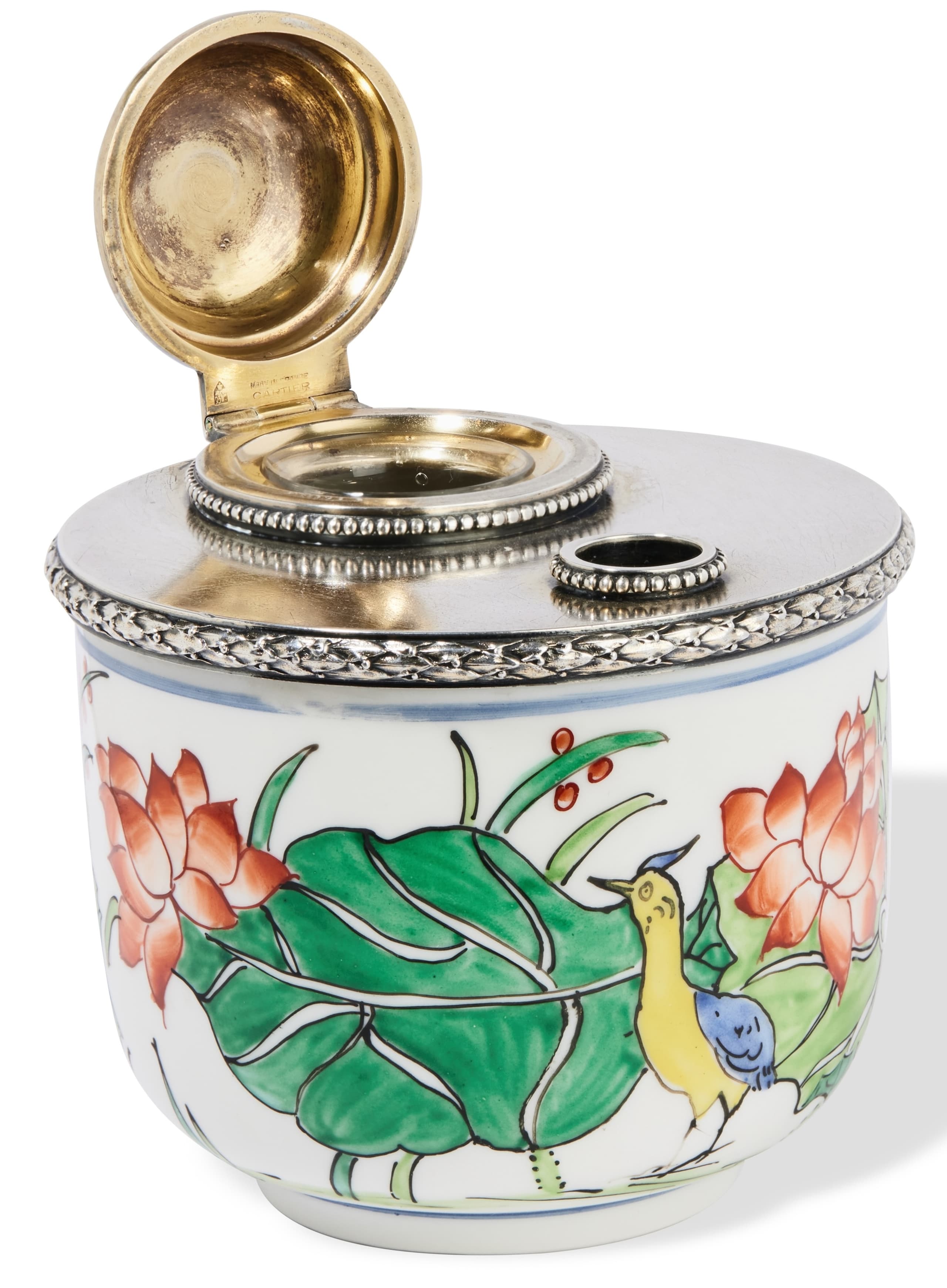 SILVER AND PORCELAIN INKWELL, R. LINZENER WORKSHOP FRO CARTIER NEW YORK, CIRCA 1947
