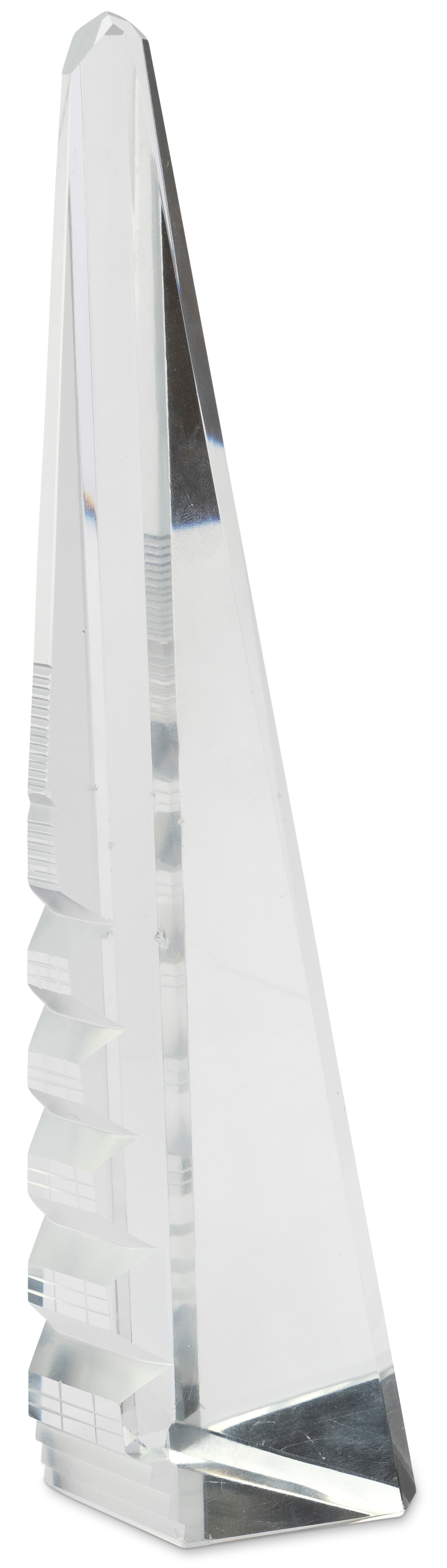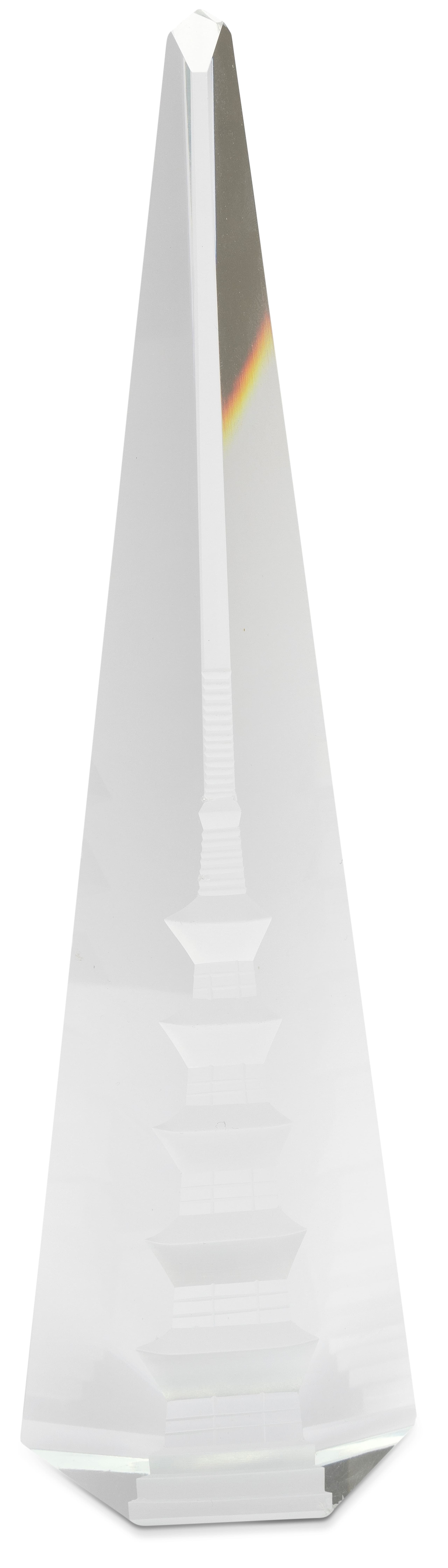 Sculpture in cut glass, slender, with a relief engraving of a pagoda and internal stepped cuts. Signed 'Cartier' H.: 29.5 cm Condition: minor chips