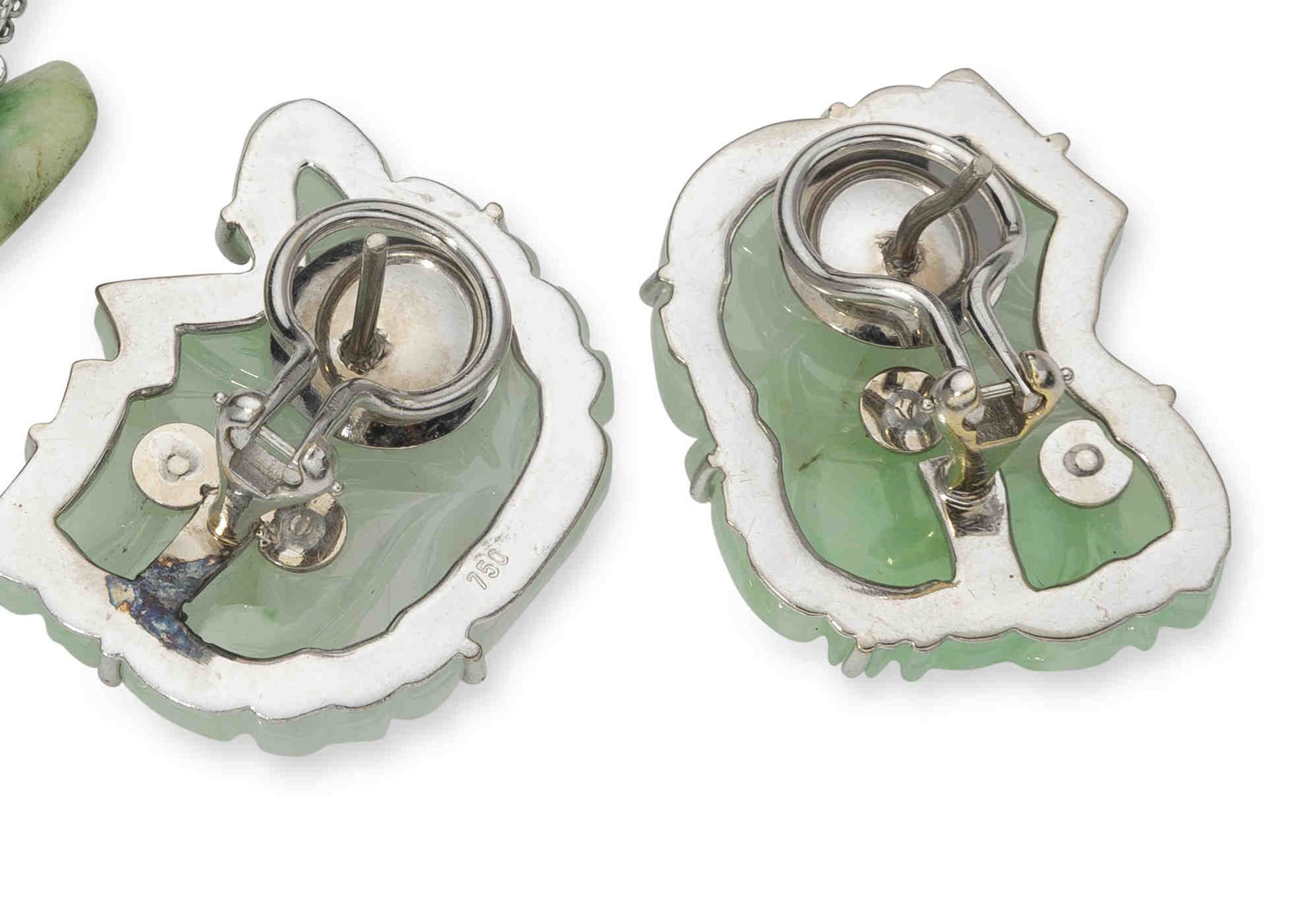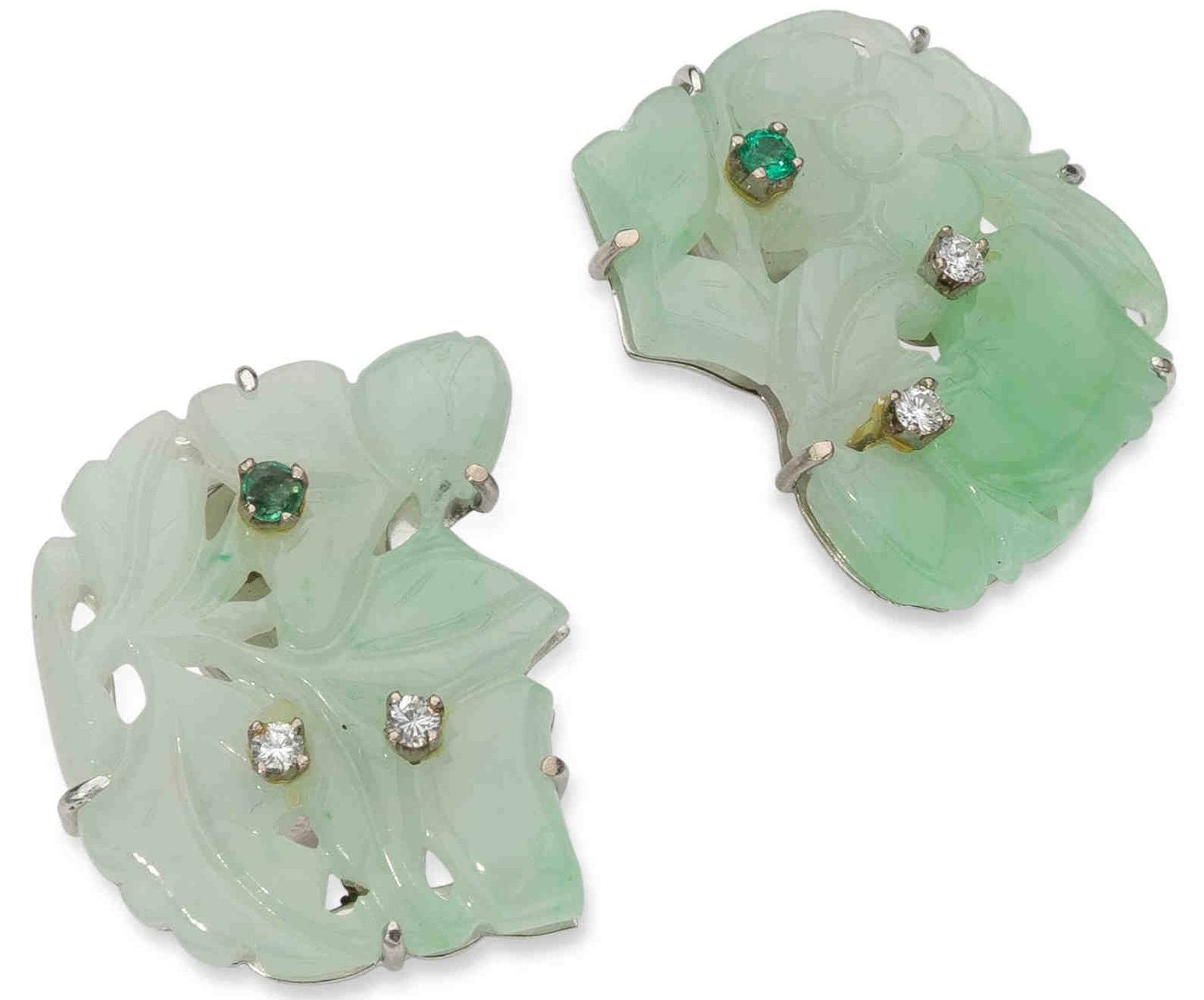 18K WHITE GOLD DIAMOND, EMERALD AND JADE EARRINGS