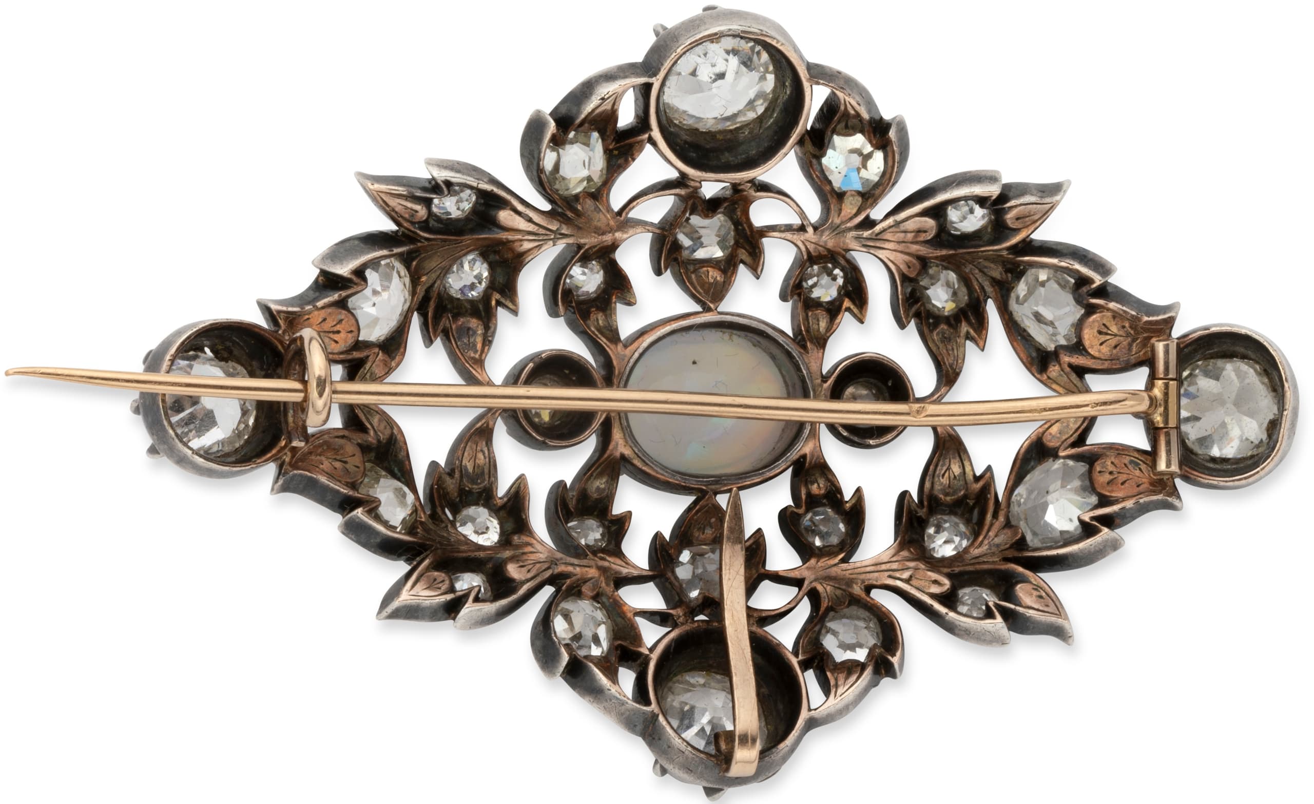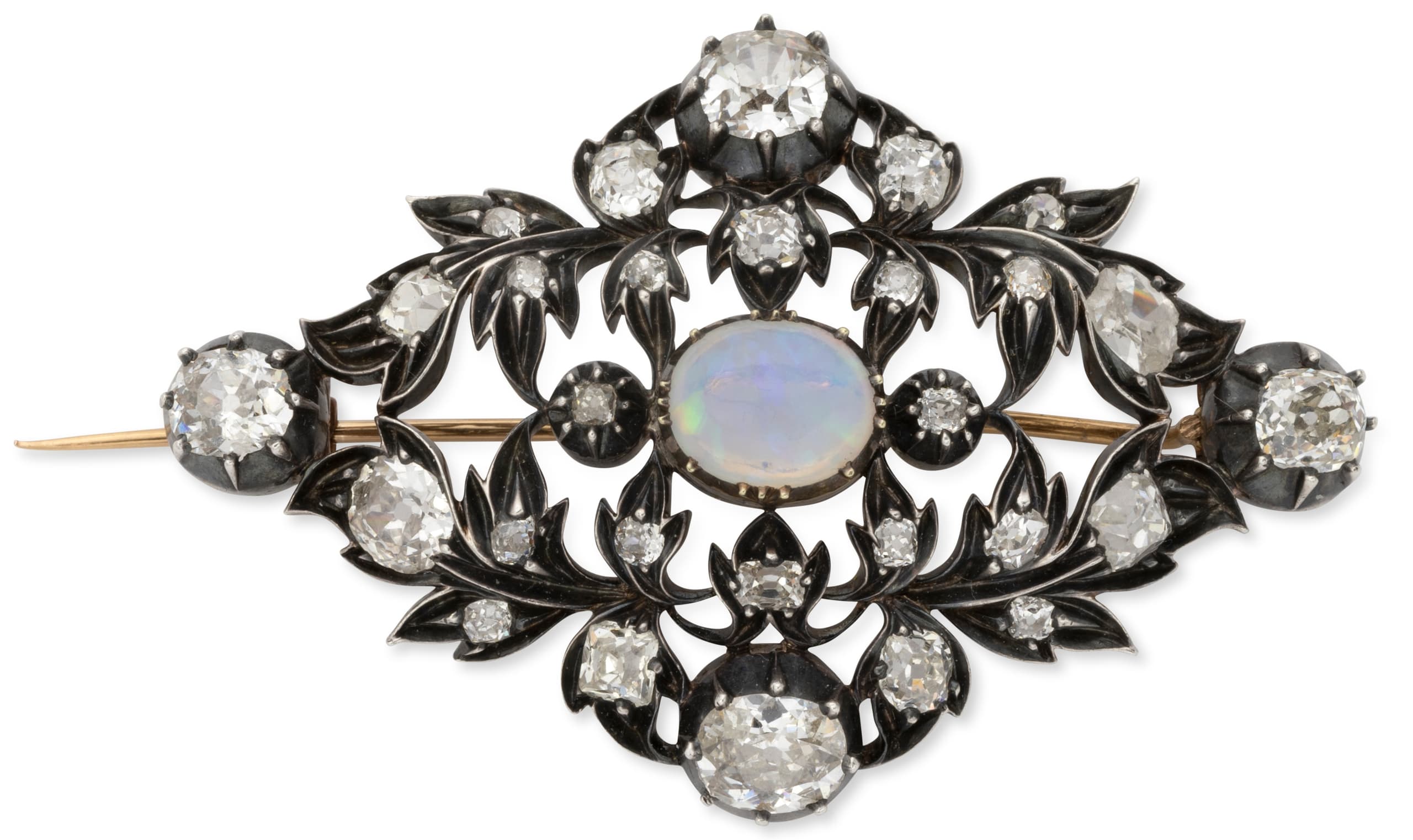 18K YELLOW GOLD AND SILVER BROOCH WITH ETHIOPIAN OPAL AND DIAMOND, 19TH CENTURY
