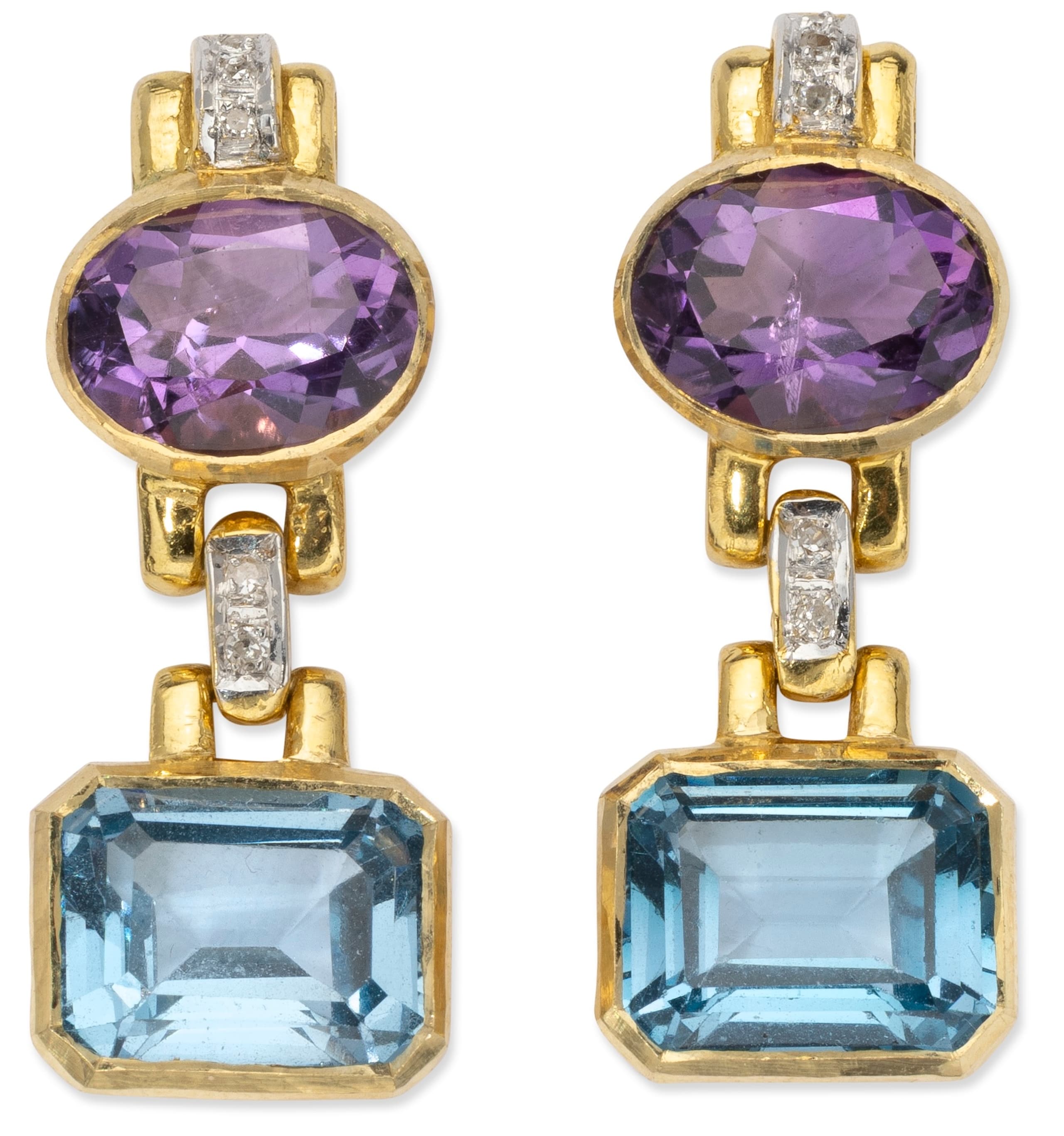 pair of 18k yellow gold earrings set with diamonds weighing in total approximately 0.20 ct., amethysts weighing in total approximately 3.30 ct. and topaz weighing in total approximately 7.00 ct.
