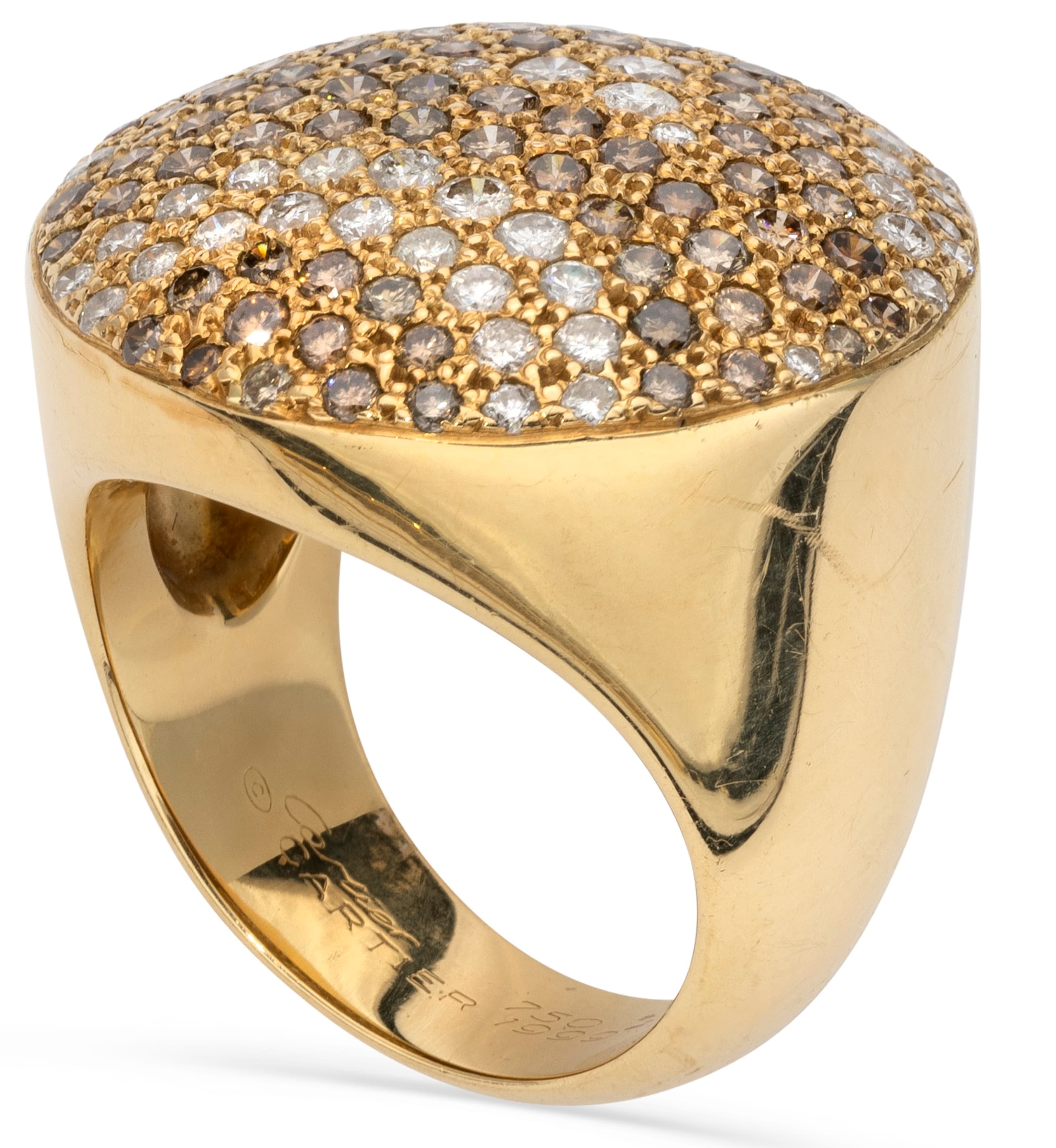 The raised dome set with 50 round diamonds and 75 diamonds of cognac colour weighing approximately 1.2 ct