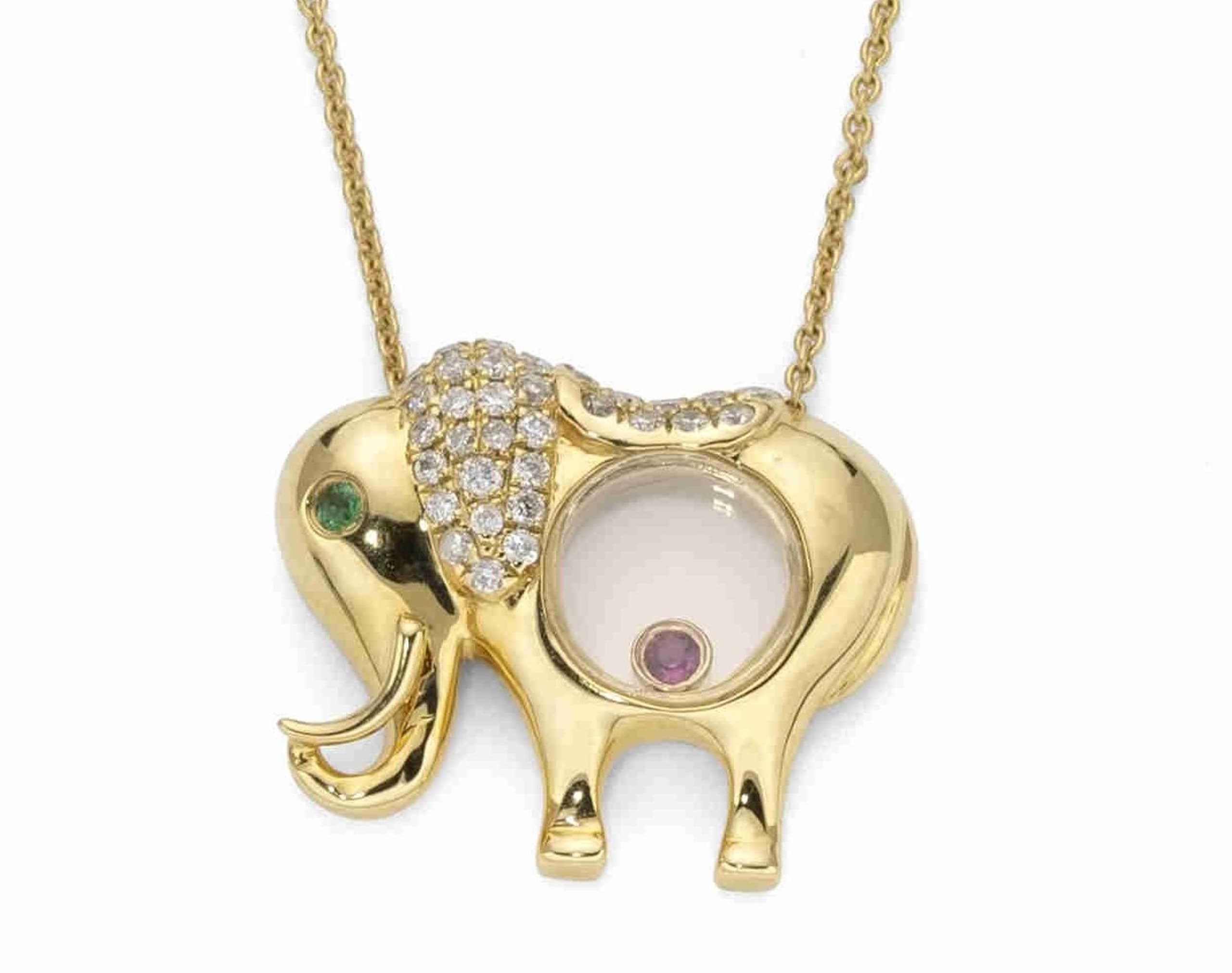18k yellow gold chain with 18k yellow gold 'Elephant' pendant set with 41 diamonds weighing approximately 0.20 ct., 1 rubis weighing approximately 0.02 ct., 1 emerald weighing approximately 0.01 ct. and glass.