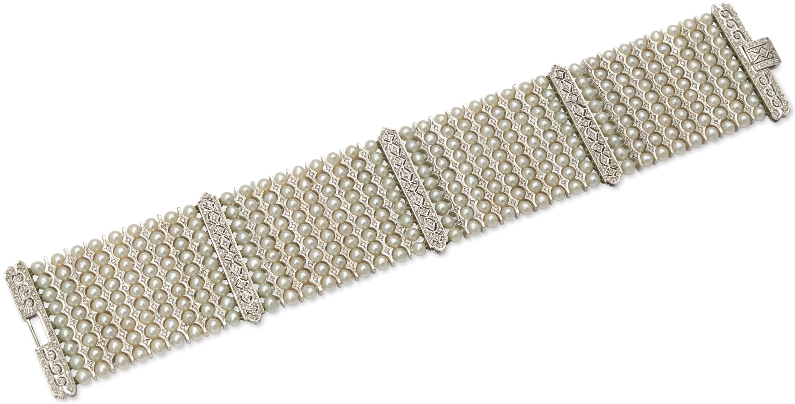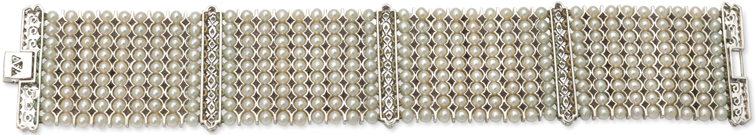 14k white gold bracelet set with freshwater pearls and brilliant-cut diamonds weighing approximately 2.00 ct. L. 20 cm Hallmarks: '585' '14k' gross weight: 87 gr.