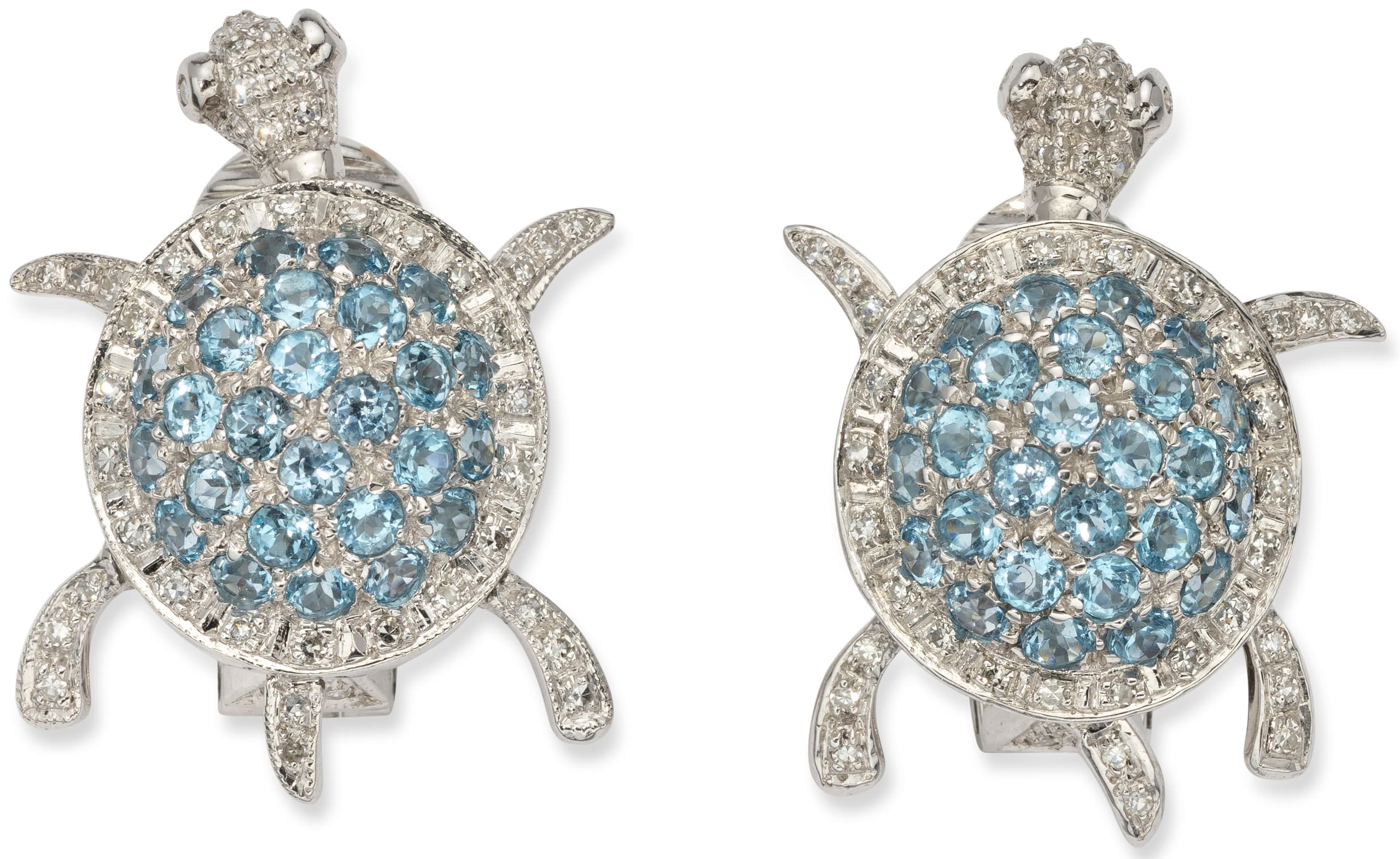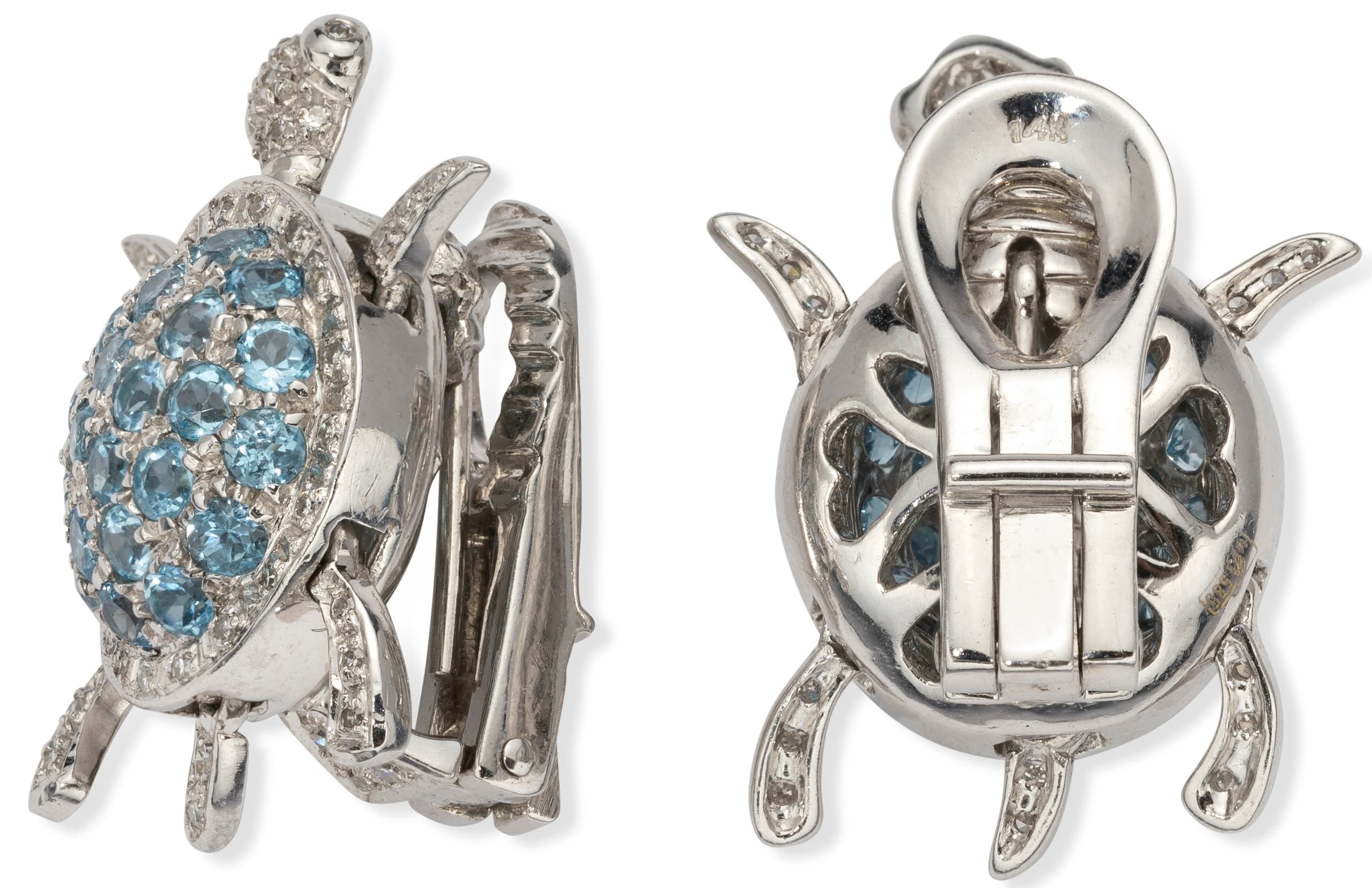 pair of 14k white gold, articulated turtles earrings / ear clips set with topaz weighing approximately 2.00 ct. and brillant-cut diamonds weighing approwimately 0.50 ct.