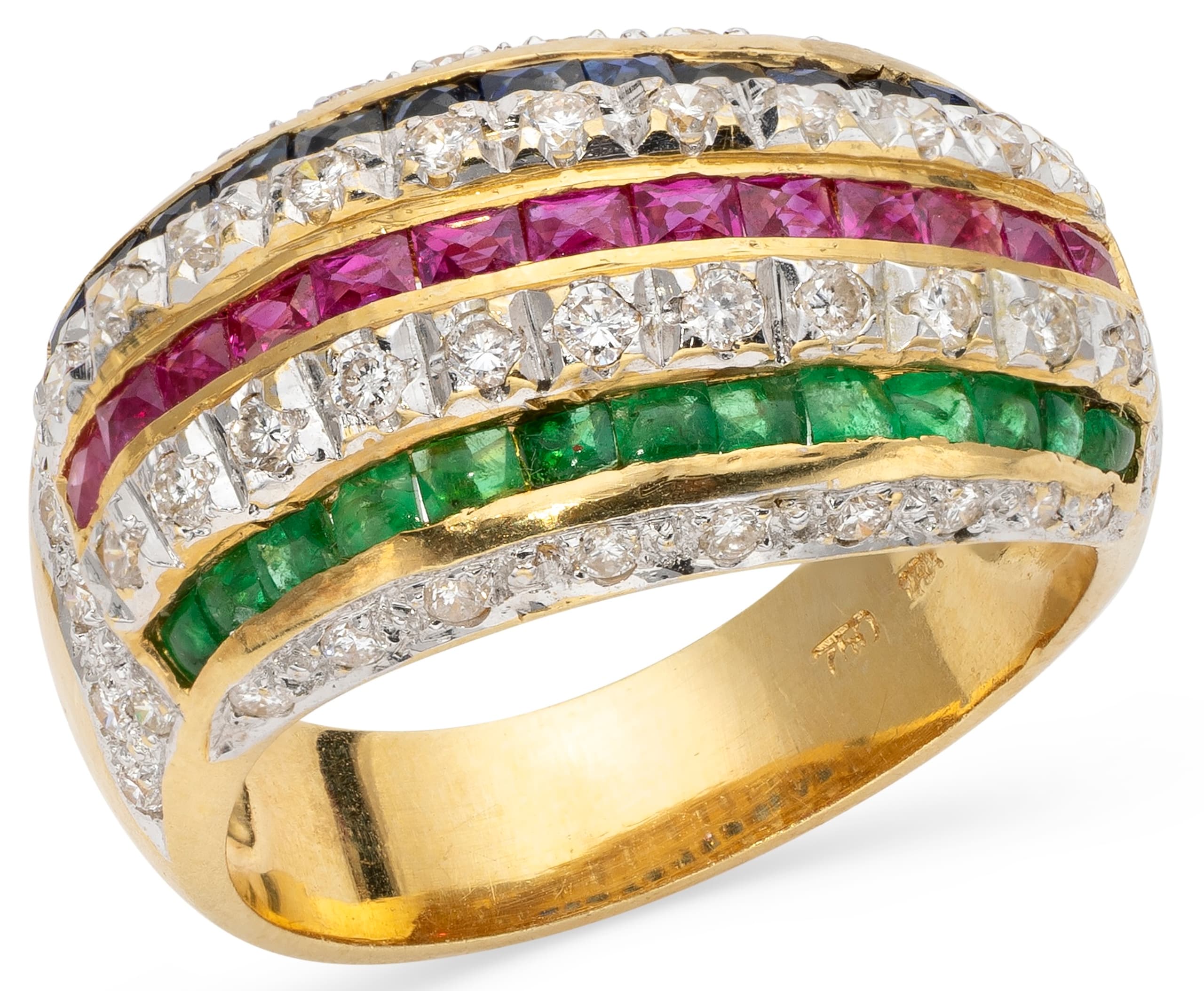 ring made in 18k yellow gold paved with brilliant-cut diamonds weighing approximately 0,7 ct. enhanced with stripes of calibrated rubies weighing approximately 0,25 ct., calibrated sapphires weighing approximately 0,20 ct. and calibrated emerald weighing approximately 0,20 ct.