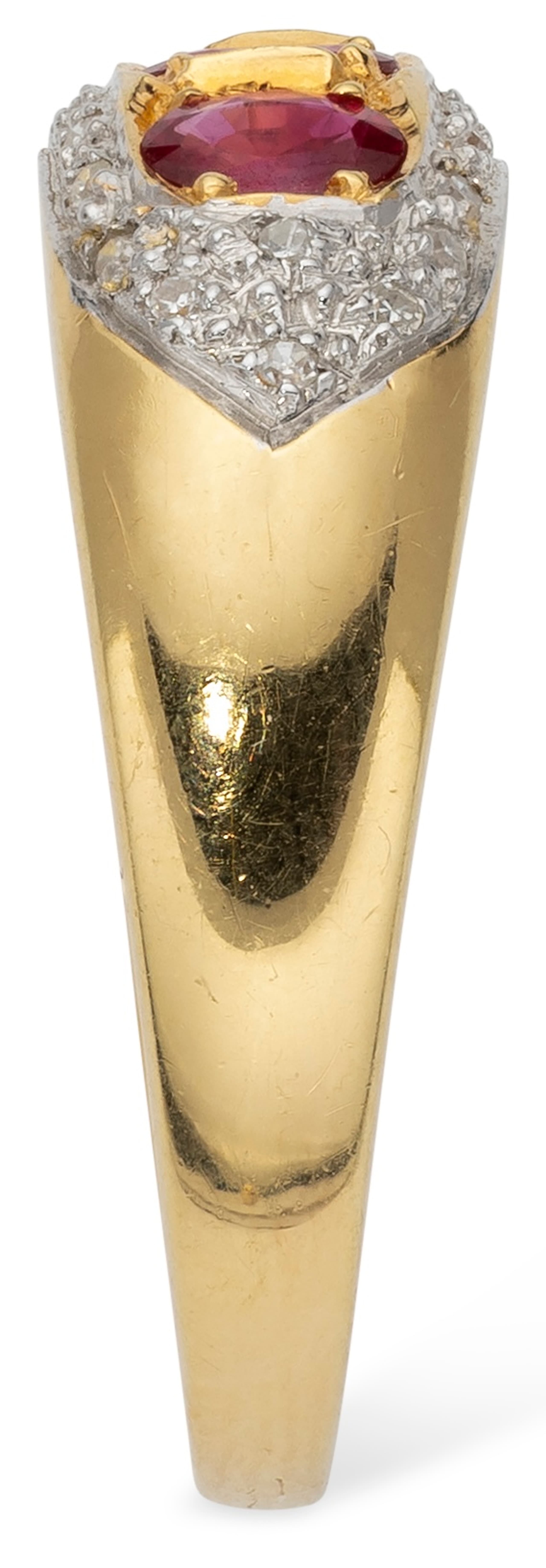 14k yellow gold ring set with brilliant-cut diamonds weighing approximately 0.10 ct. and rubies weighing approximately 0.20 ct.