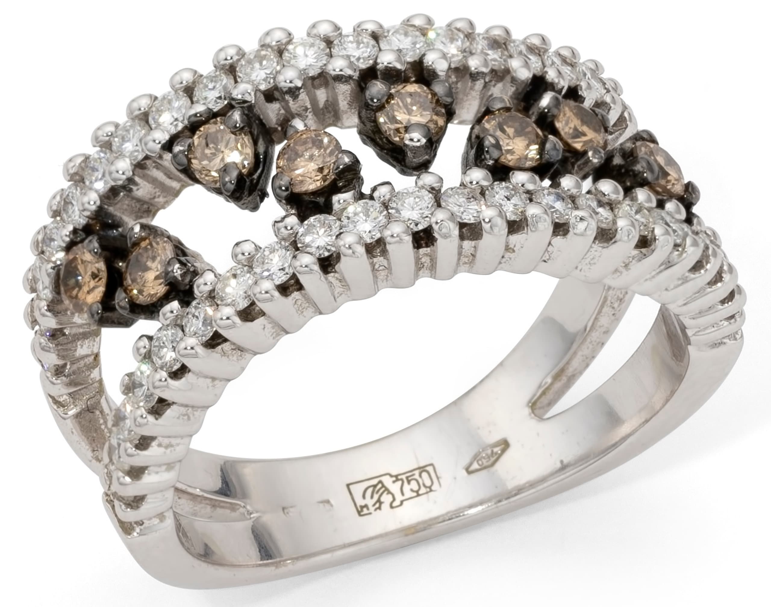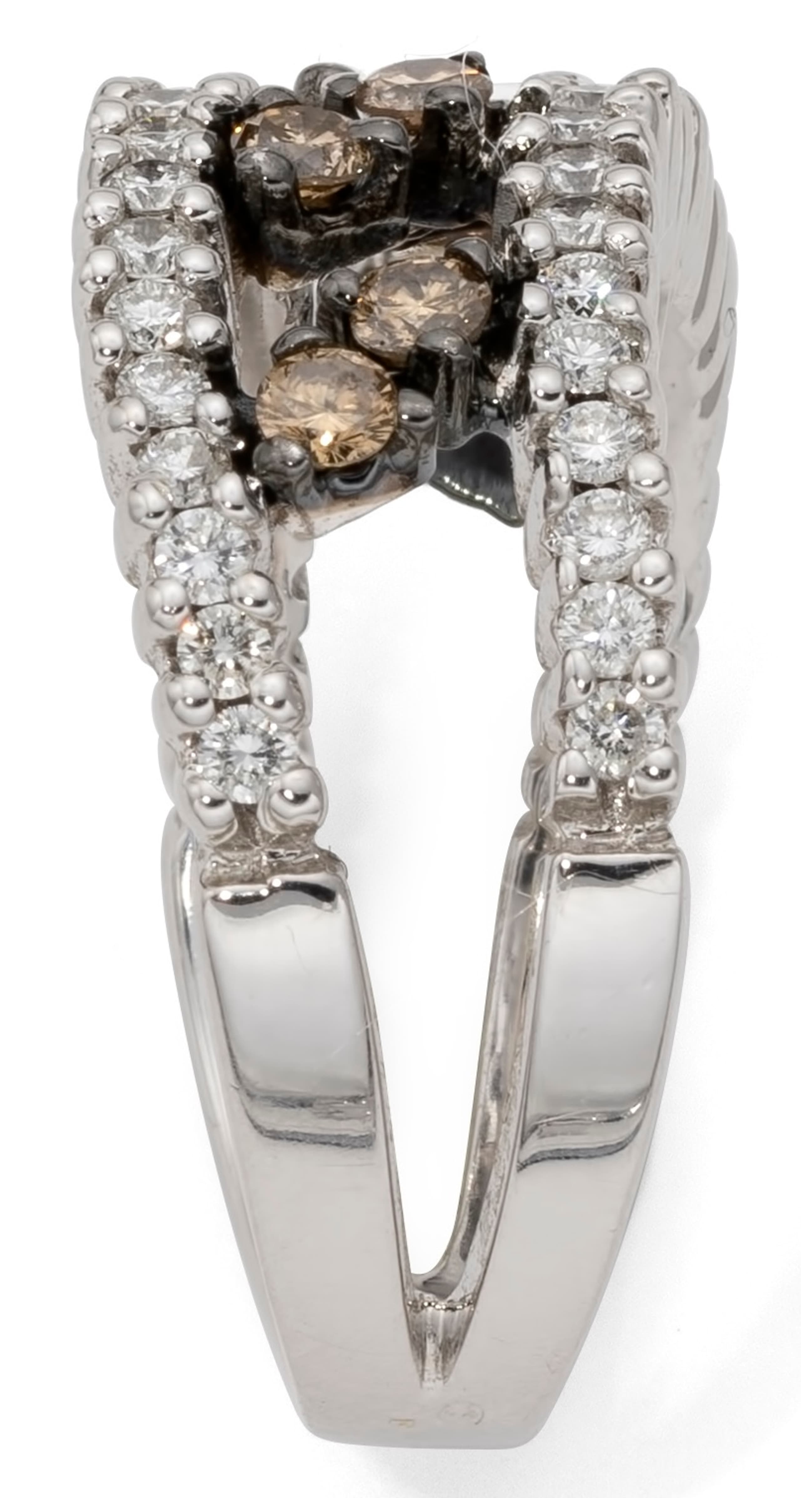 18k white gold openwork ring set with cognac brilliant cut diamonds weighing approximately 0.30 ct. and white brilliant cut diamonds weighing approximately 0.55 ct.