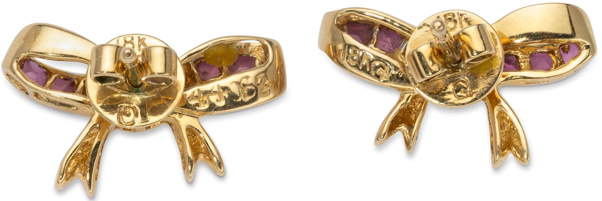 pair of 18k yellow gold bow stud earrings set with diamonds weighing in total approximately 0.08 ct. and rubies weighing in total approximately 0.30 ct.