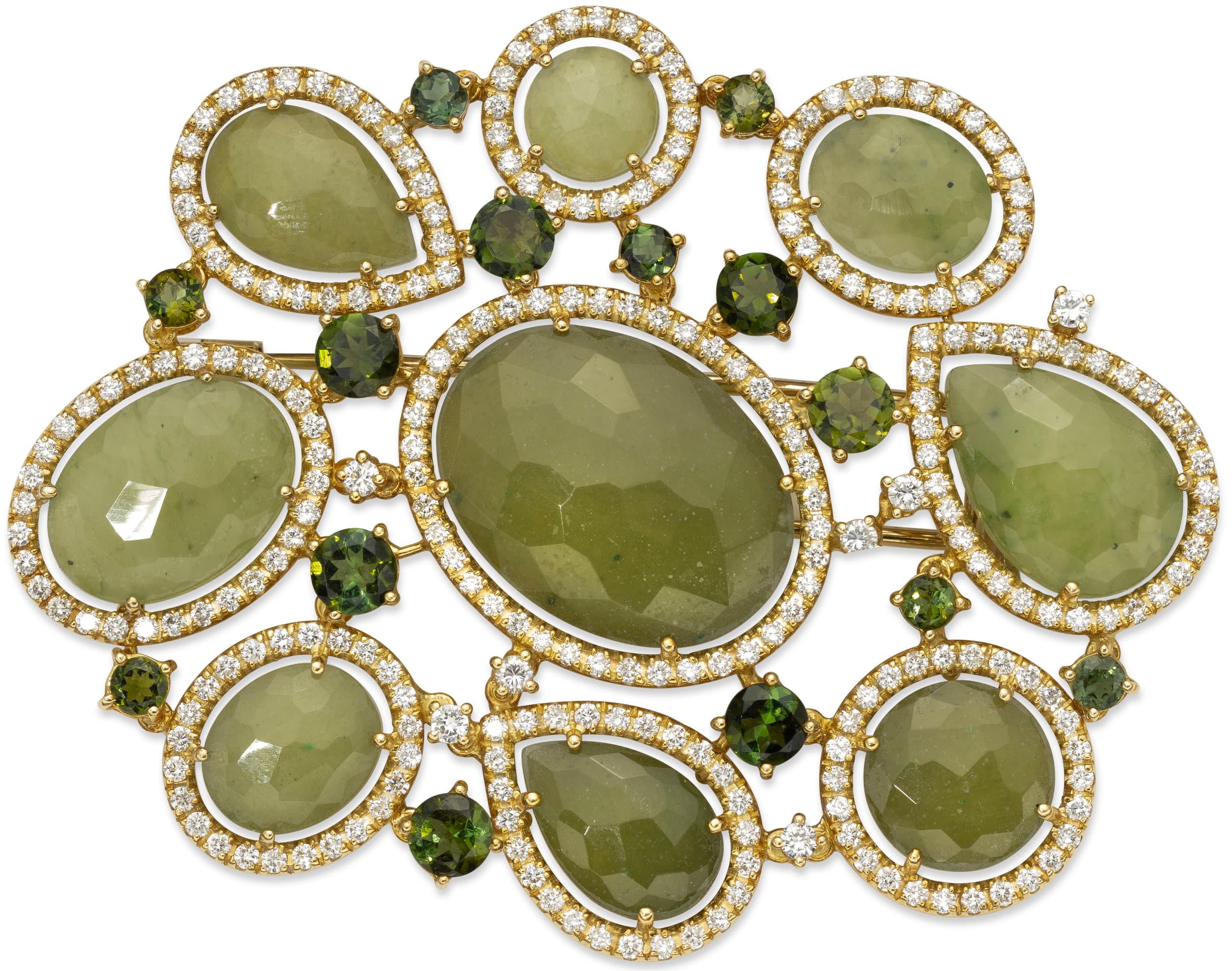 18K GOLD BROOCH WITH PERIDOT, GREEN CHALCEDONIES