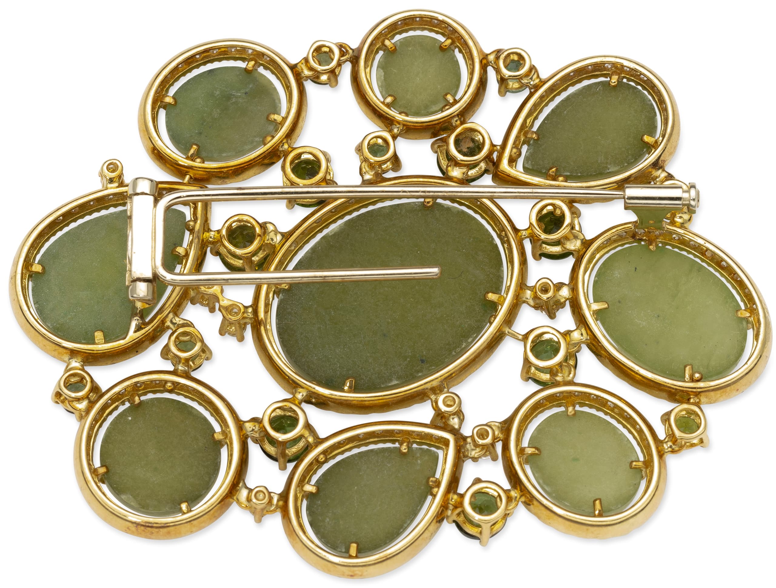 Brooch in 18K gold with peridot, green chalcedonies L.: 6.5 cm Total gross weight: 26.90 gr.