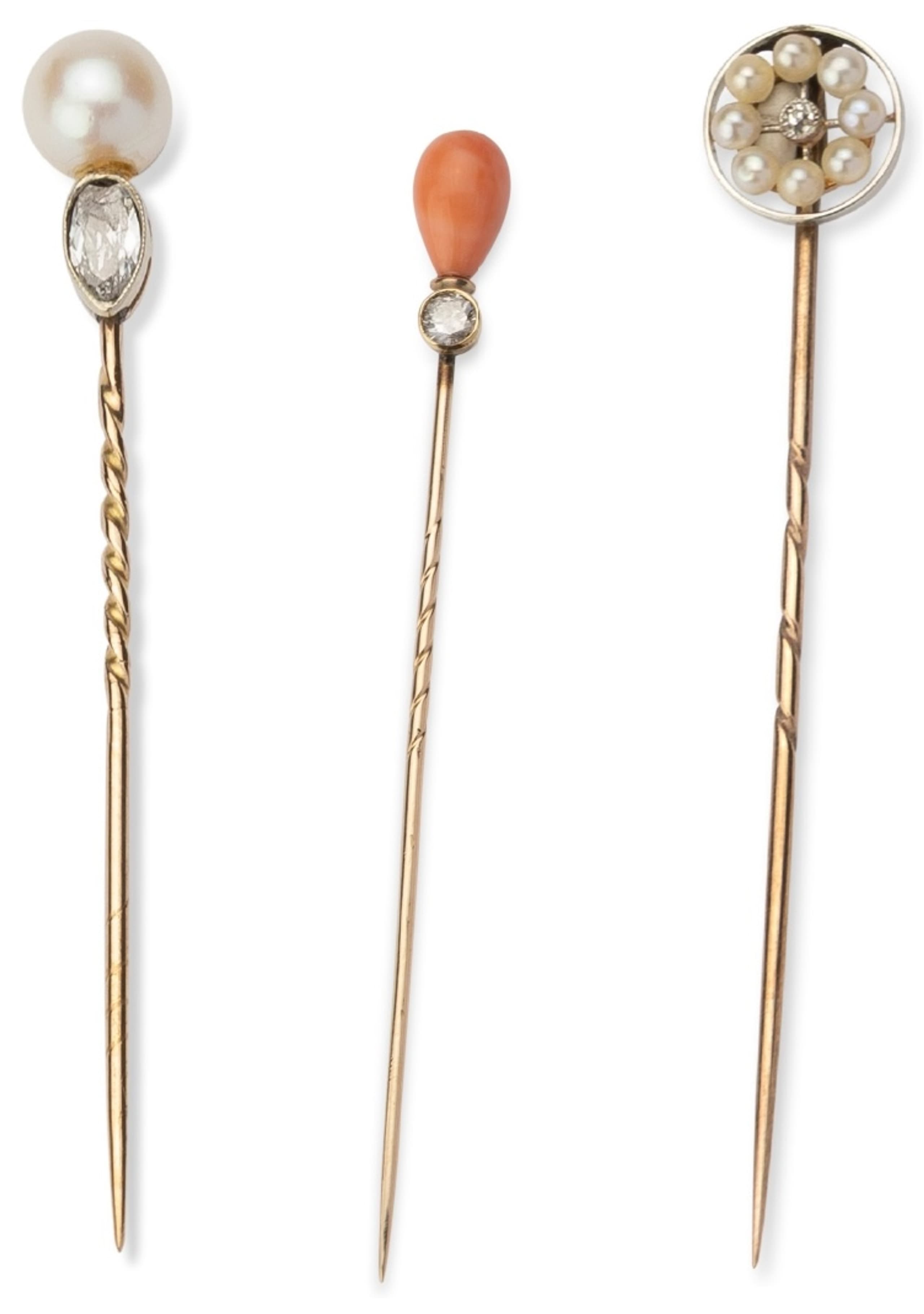 three gold tie pins adorned with eight pearls and a diamond, pearls and brilliant-cut diamonds, and coral and a brilliant-cut diamond