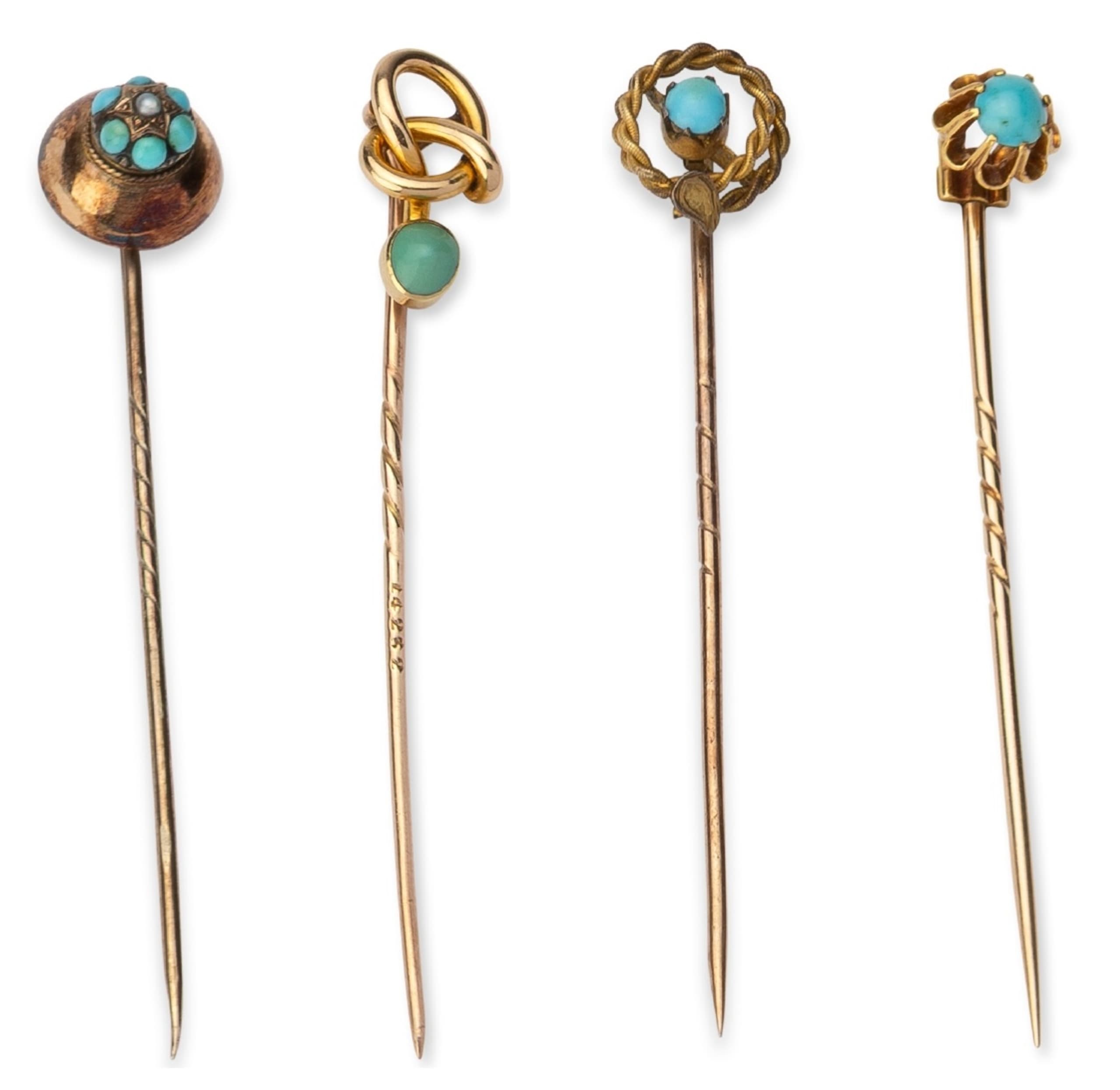 four tie pins, one in 14k gold set with turquoise beads, one in 15k gold set with cabochon turquoise, one in 14k gold set with cabochon turquoise, and one in 18k gold set with cabochon turquoise