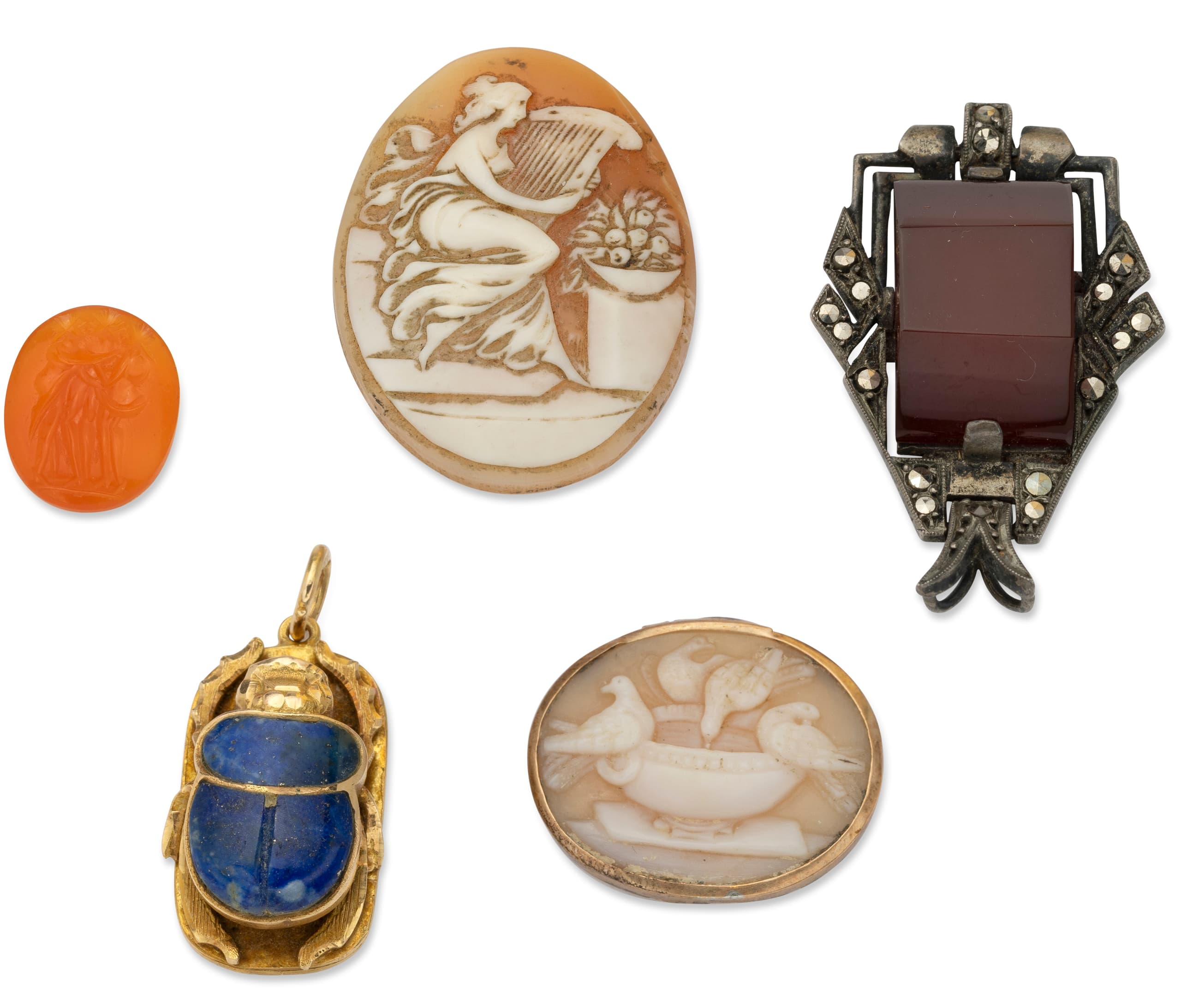 Set of 5 pendants including a 18k yellow gold scarab pendant with lapis-lazuli H. 2.5 cm total gross weight: 6.69 gr.