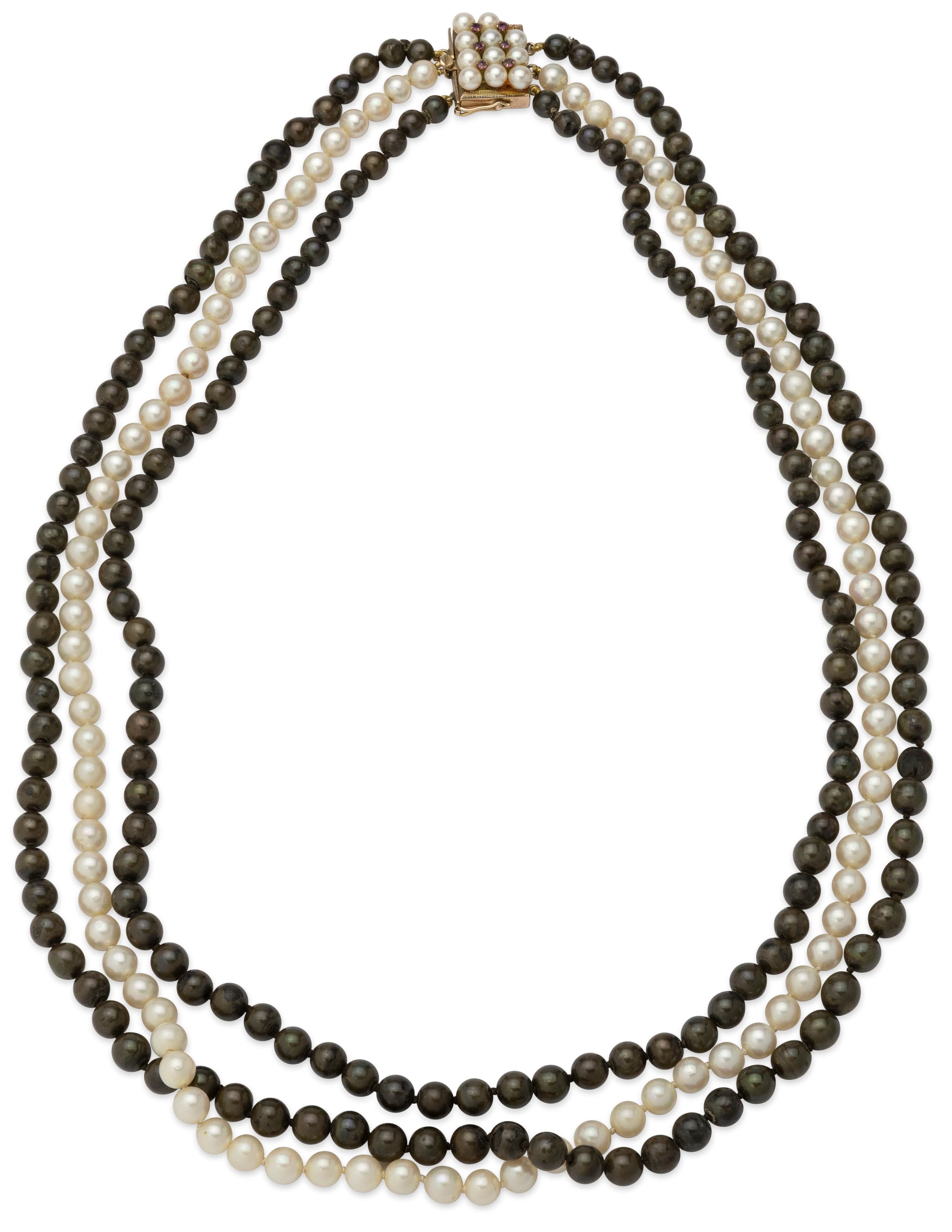 3-strand necklace with cultured pearls, 14K gold clasp set with rubies and pearls Hallmark: ‘14K’ Condition: one pearl missing on the claps