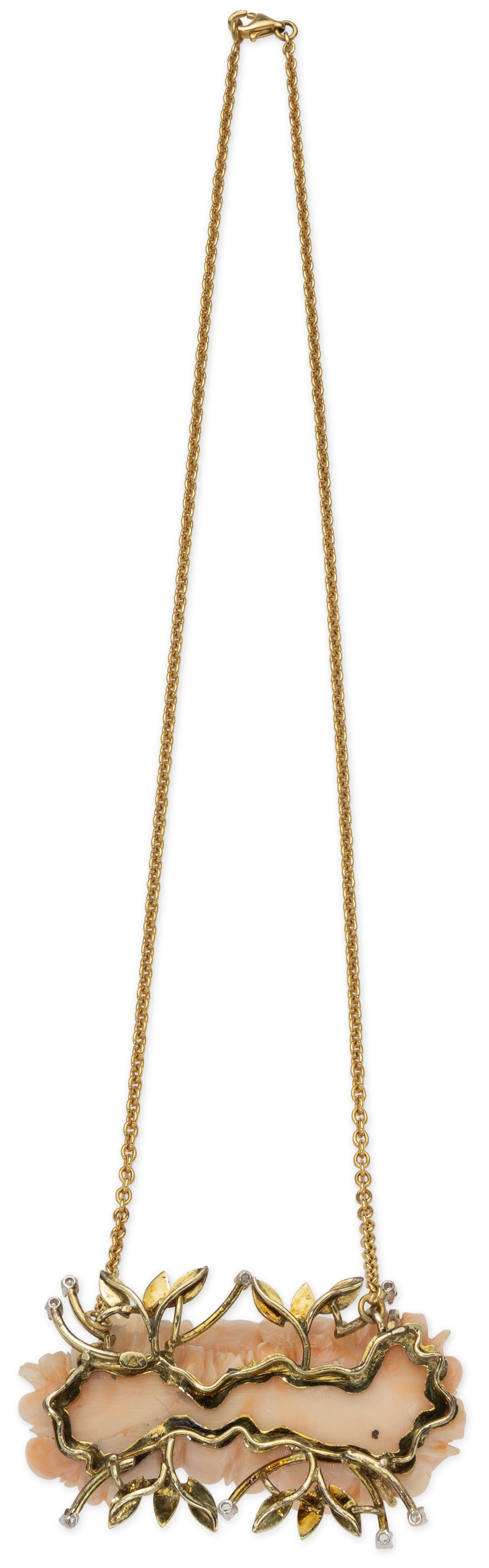 Chain in 18K gold with 14K gold angel skin coral pendant in the shape of a chrysanthemum, set with diamonds weighing approximately 0.10 ct.