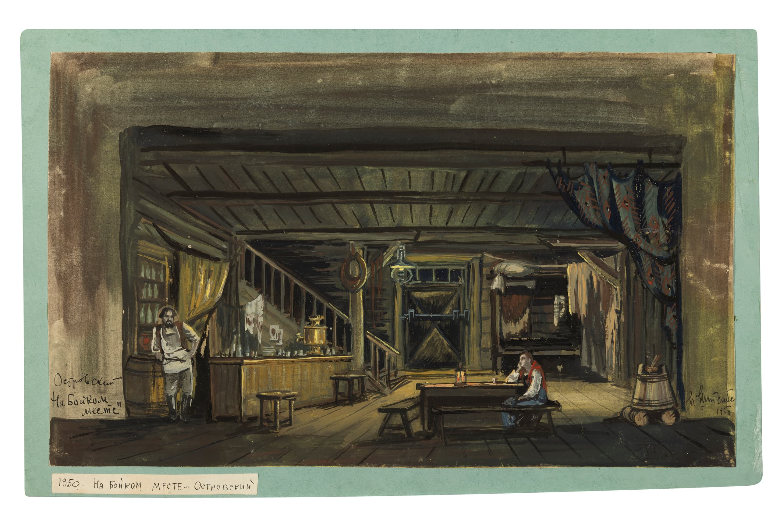 signed in Cyrillic ‘I. Stenberg / 1950 / III akt’ (lower right), inscribed in Cyrillic ‘Ostrovsky / Na boykom meste’ (lower left)