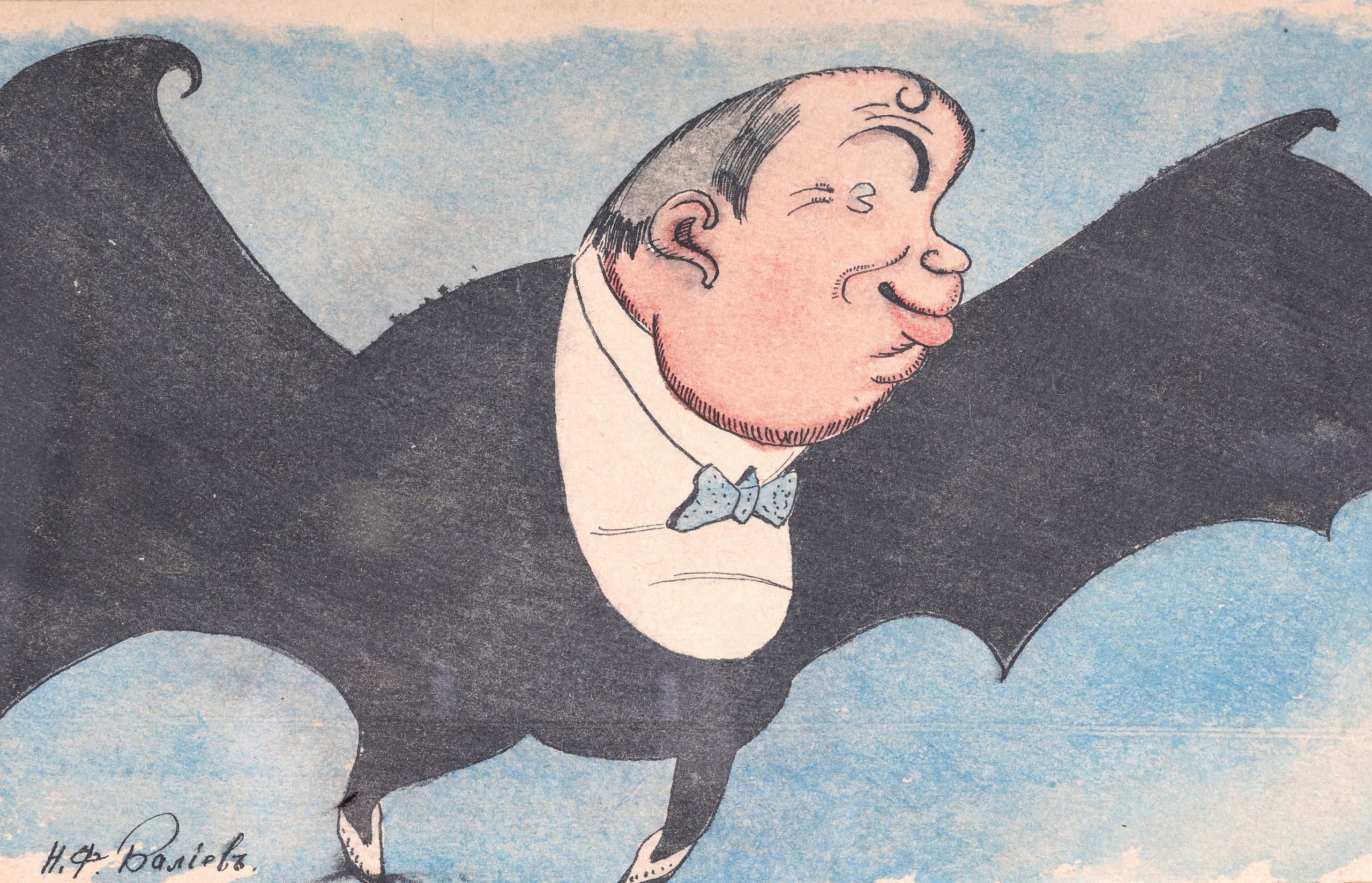 Remizov worked as a theatre set designer and painter for the company. He designed sets and costumes for productions, as well as creating illustrations for the theatre’s promotional material. Drawing on the tradition of the Russian illustrated press, his satirical, graphic style was perfectly in keeping with the ironic, theatrical cabaret spirit of La Chauve-Souris.