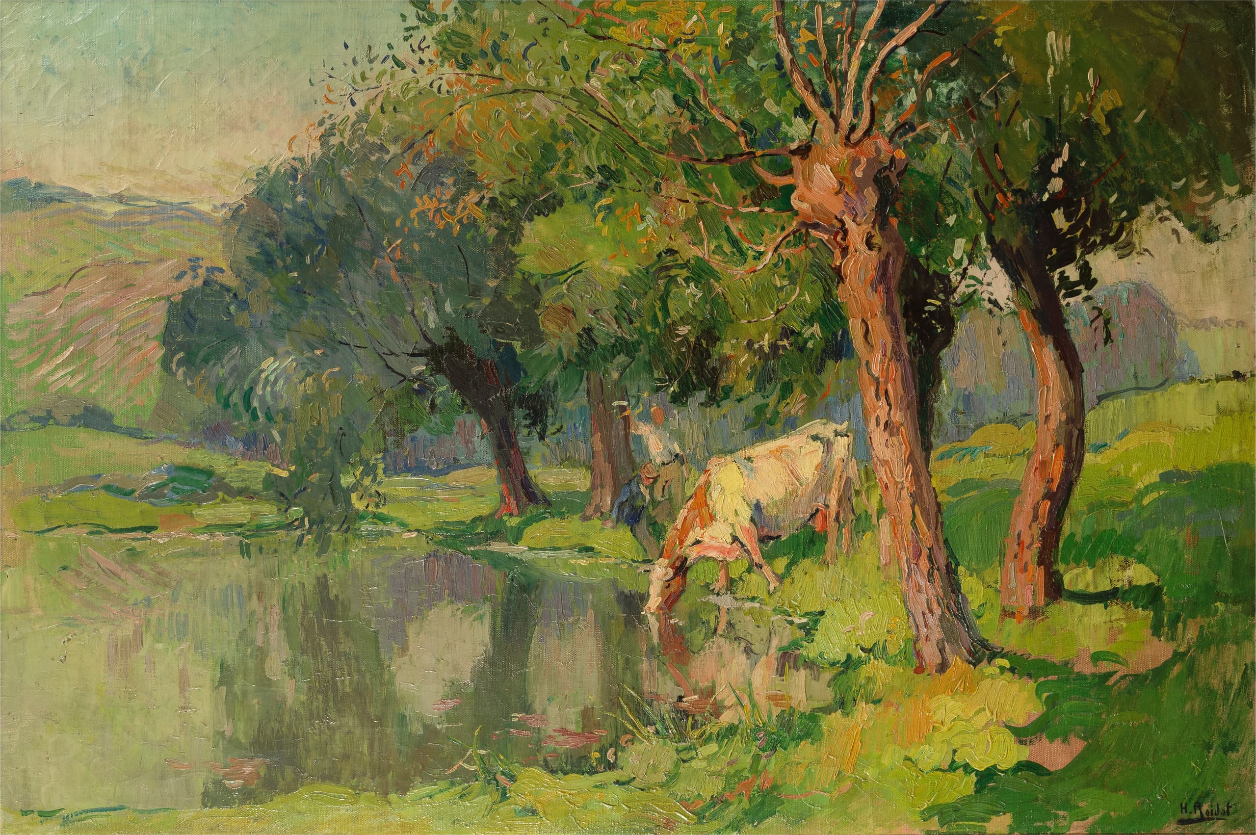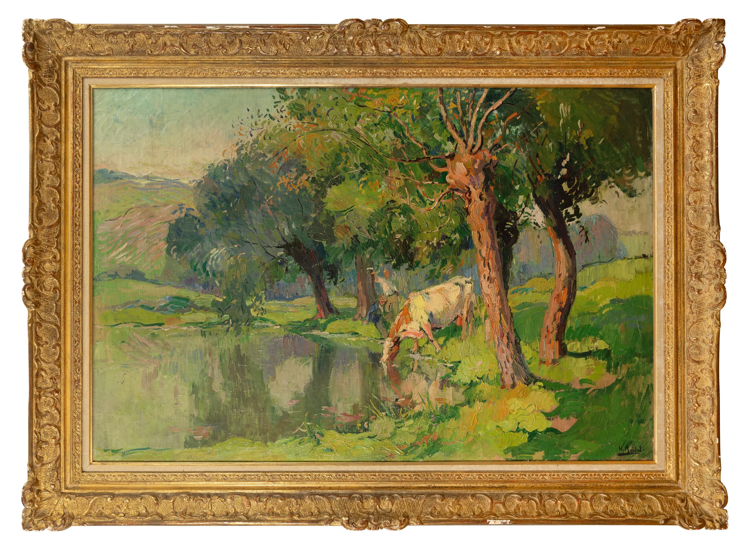 HENRI ROIDOT (1877-1960) Paysage avec vache s’abreuvant