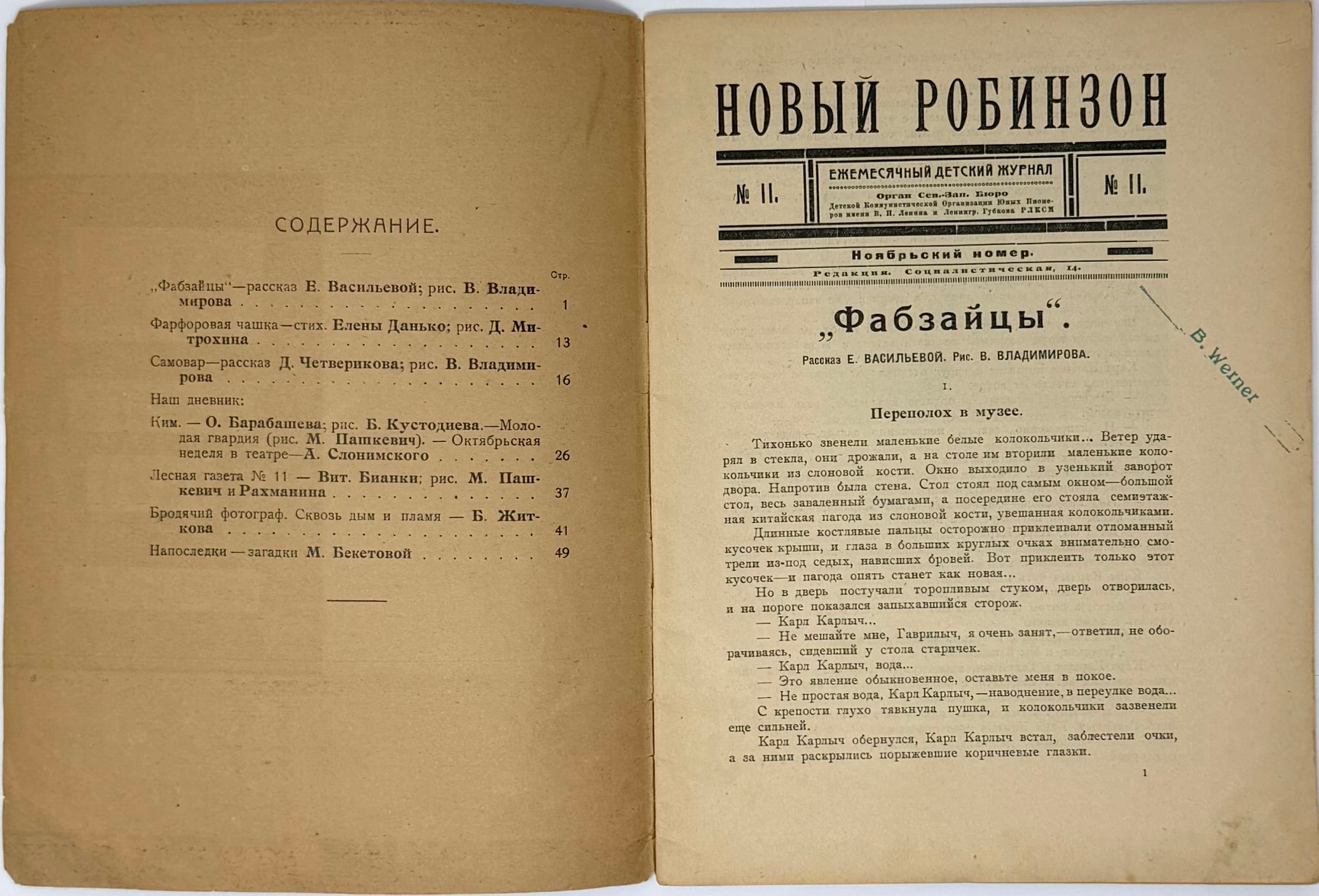 NOVYY ROBINZON ['New Robinson']. Monthly children’s journal. No. 11. November. Leningrad: Leningradskaya pravda, 1924. A rare children’s periodical.