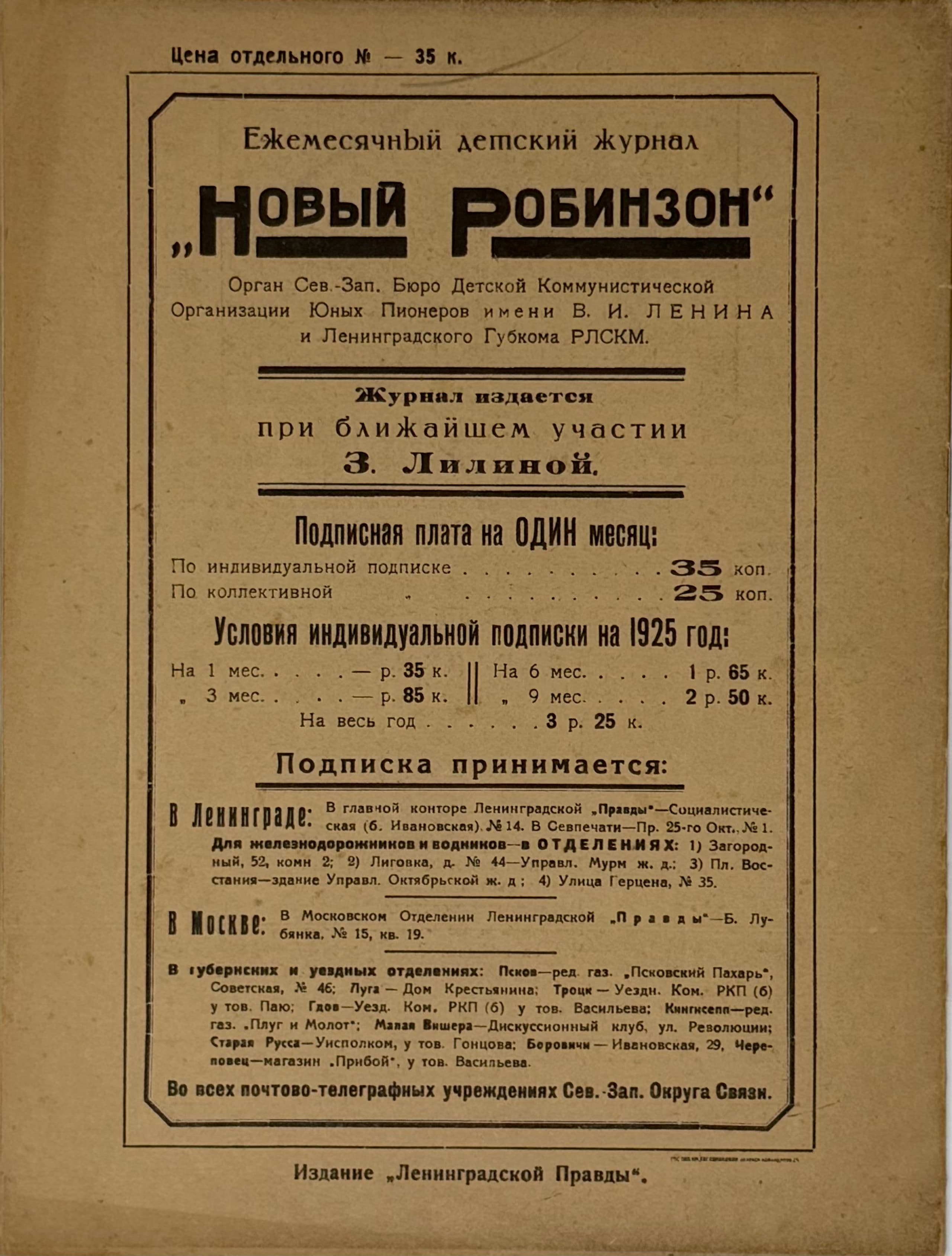 From November 1924 the children’s magazine ‘Vorobey’ was issued under the title ‘Novyy Robinson’. The nominal editor was Z.I. Lilina, while the actual editor was S.Ya. Marshak, who was not even formally listed as a member of the editorial staff. The editorial board included members of Marshak’s literary circle, founded in 1922 at the Library of the Institute of Preschool Education: B. Zhitkov, V. Bianki, O. Kapitsa, E. Privalova.