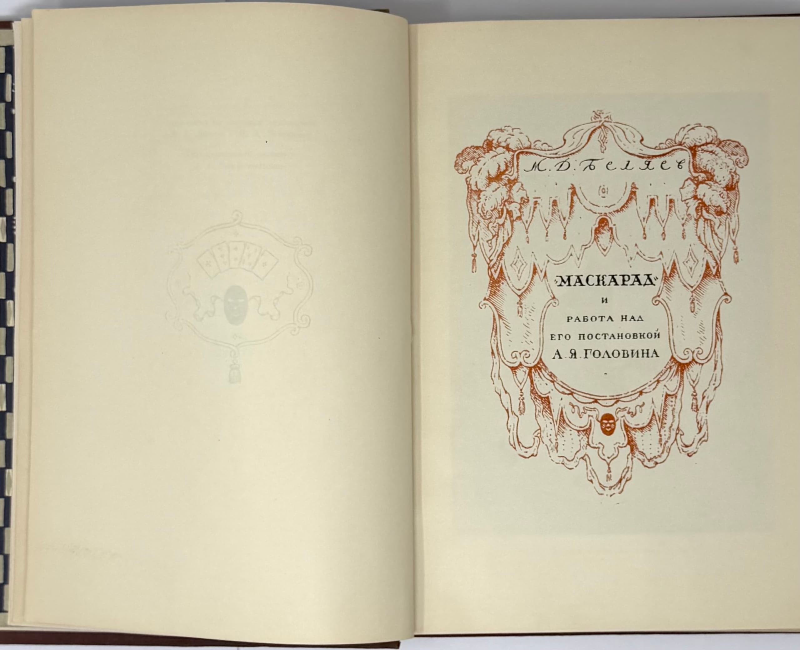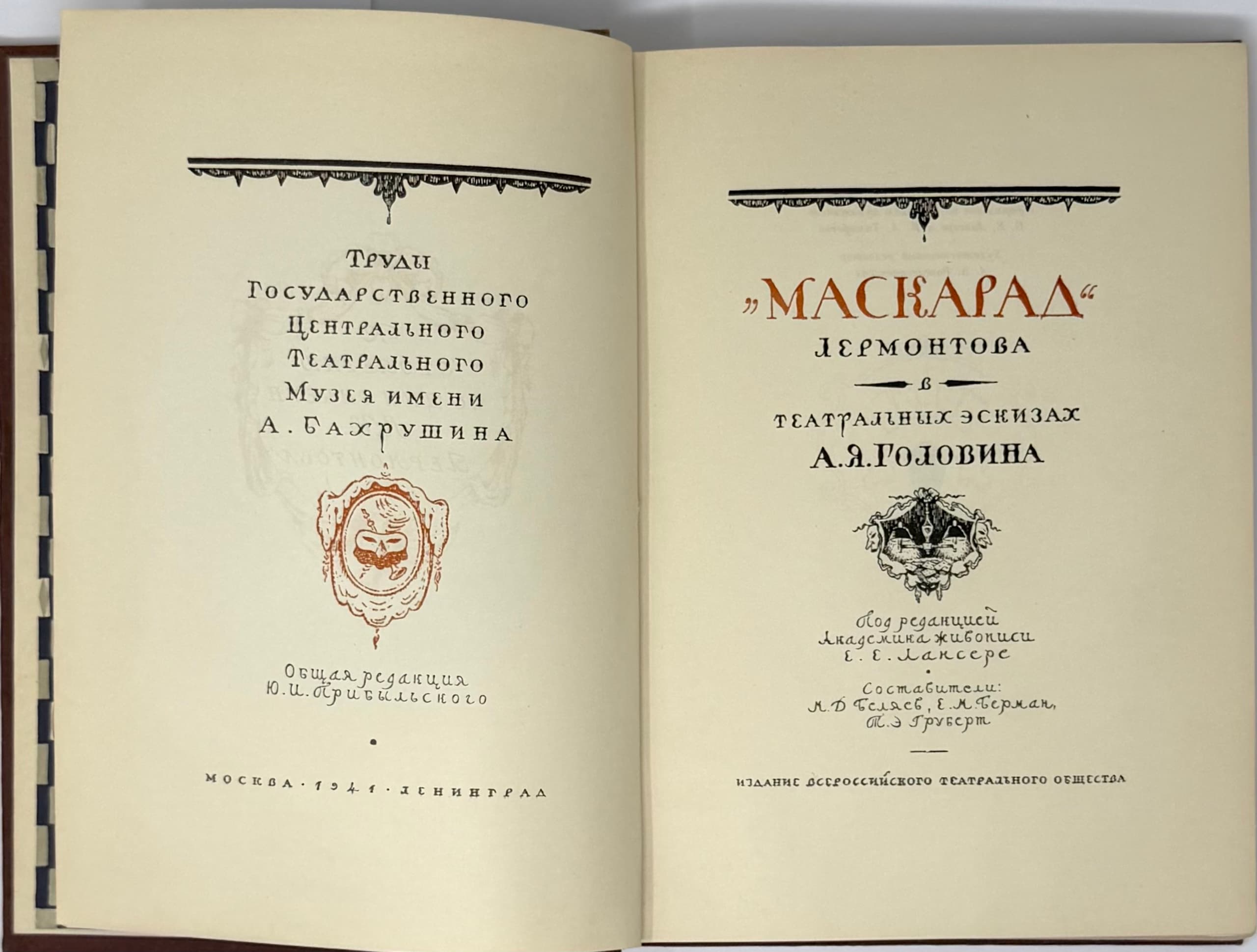 ON THE 100TH ANNIVERSARY OF THE DEATH OF M.Y. LERMONTOV: 1841–1941 ‘Maskarad’ Lermontova v teatral’nykh eskizakh A.Ya. Golovina ['Lermontov’s 'Masquerade' in Theatrical Designs by A.Ya. Golovin']; remainder by M.D. Belyaev, E.M. Berman, T.E. Grubert; edited by E.E. Lanceray. Moscow; Leningrad: Izd. Vserossiyskogo teatral’nogo obshchestva, 1941.