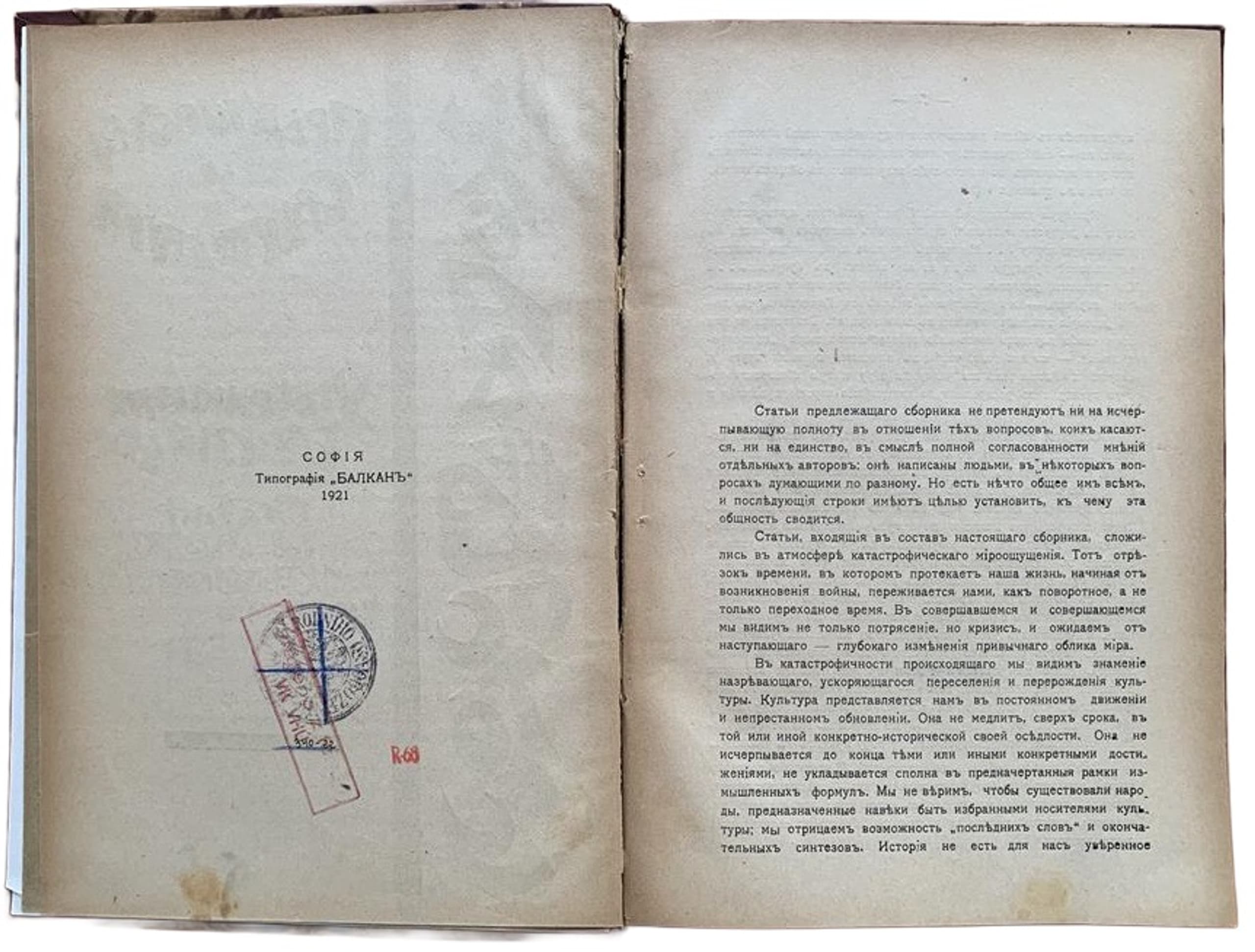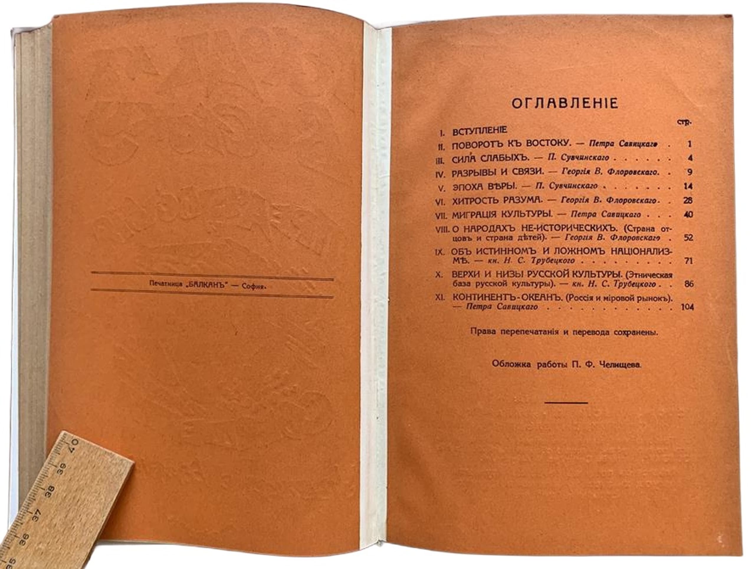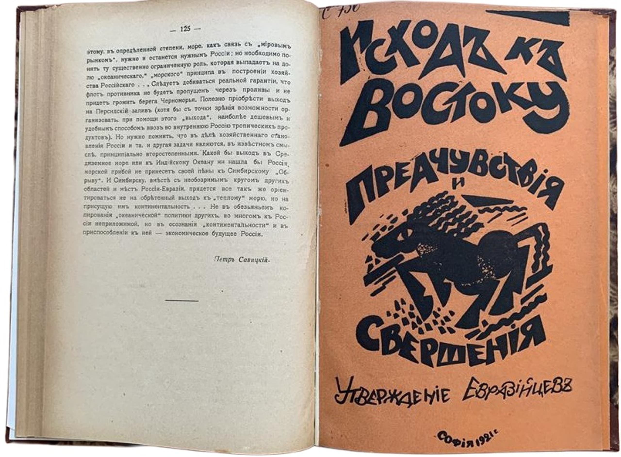 [EURASIANS] Iskhod k Vostoku: predchuvstviya i sversheniya: utverzhdenie evraziytsev ['Exodus to the East: Presentiments and Achievements: The Affirmation of the Eurasians']; articles by P. Savitskiy, P. Suvchinskiy, Prince N.S. Trubetskoy and Georgiy Florovskiy. Sofia: Balkan, 1921.