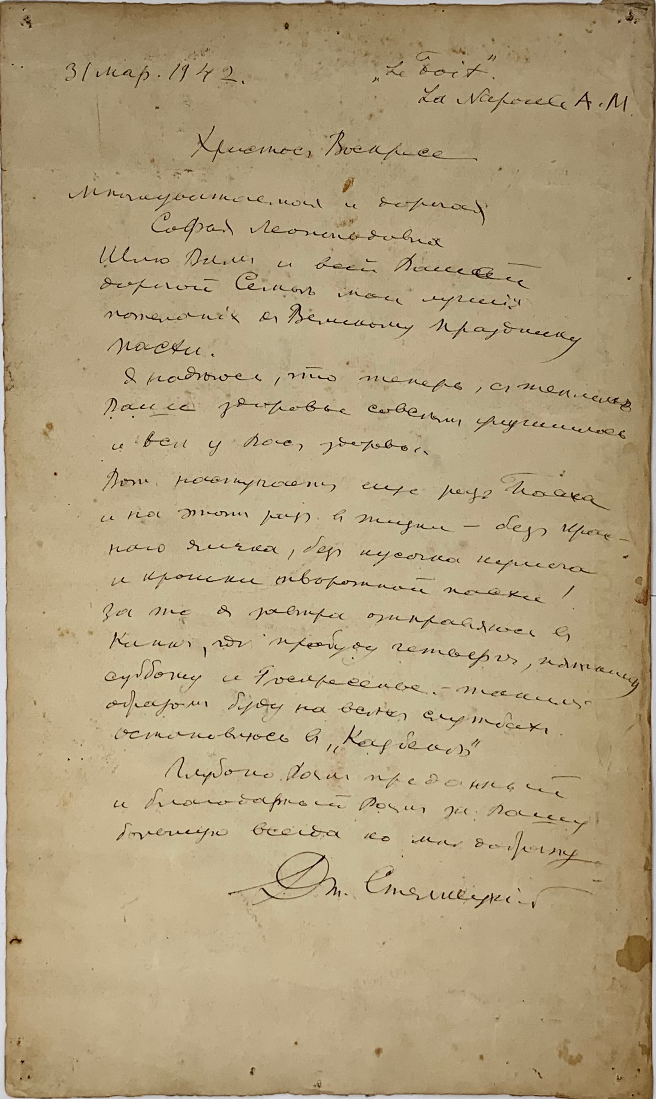 Handwritten letter in Cyrillic from Dimitri Stelletsky to Sofia Leonidovna Bark on 31 March 1942 from La Napoule, during the occupation of the South of FRANCE: 'Khristos Voskrese' ['Christ is Risen. Dear Sophia Leonidovna, I send you and to your dear family my best wishes for the Great feast of Easter... Here comes Easter once again, and this time in my life - without a red egg, without a slice of kulich and a crumb of the quark Easter cake! But tomorrow I am going to Cannes, where I will stay on Thursday, Friday, Saturday and Sunday - so I will be present in all Easter services in the church (...) D. Stelletsky'