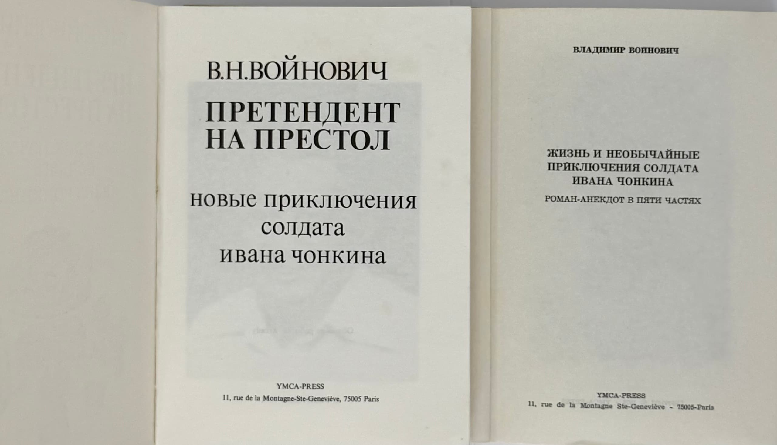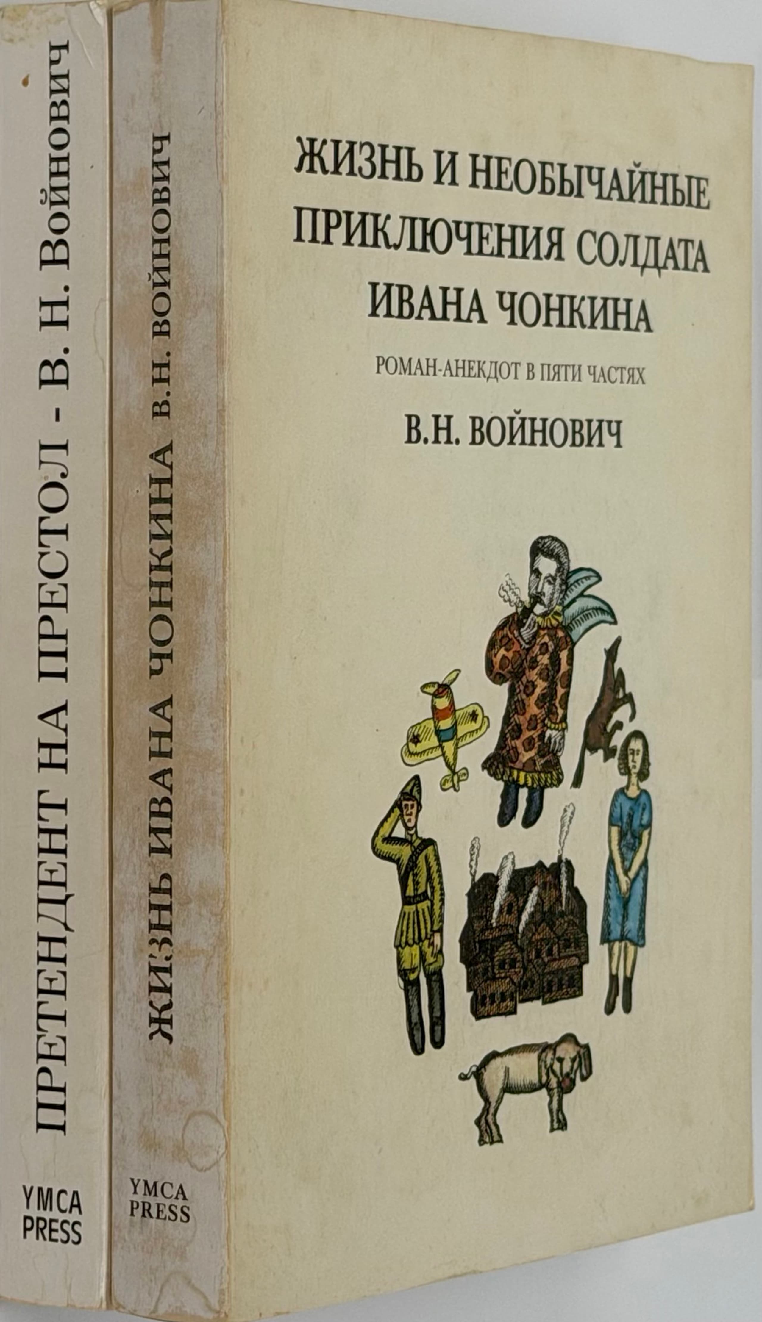 VOYNOVICH, V.N. (1932–2018) Two Volumes from a Trilogy Banned in the USSR 1) Zhizn’ i neobychaynye priklyucheniya soldata Ivana Chonkina: roman-anekdot v pyati chastyakh ['The Life and Extraordinary Adventures of Private Ivan Chonkin: A Novel-Anecdote in Five Parts']. Paris: YMCA-Press, 1975 2) Pretendent na prestol: novye priklyucheniya soldata Ivana Chonkina ['The Pretender to the Throne: New Adventures of Private Ivan Chonkin']. Paris: YMCA-Press, 1979.