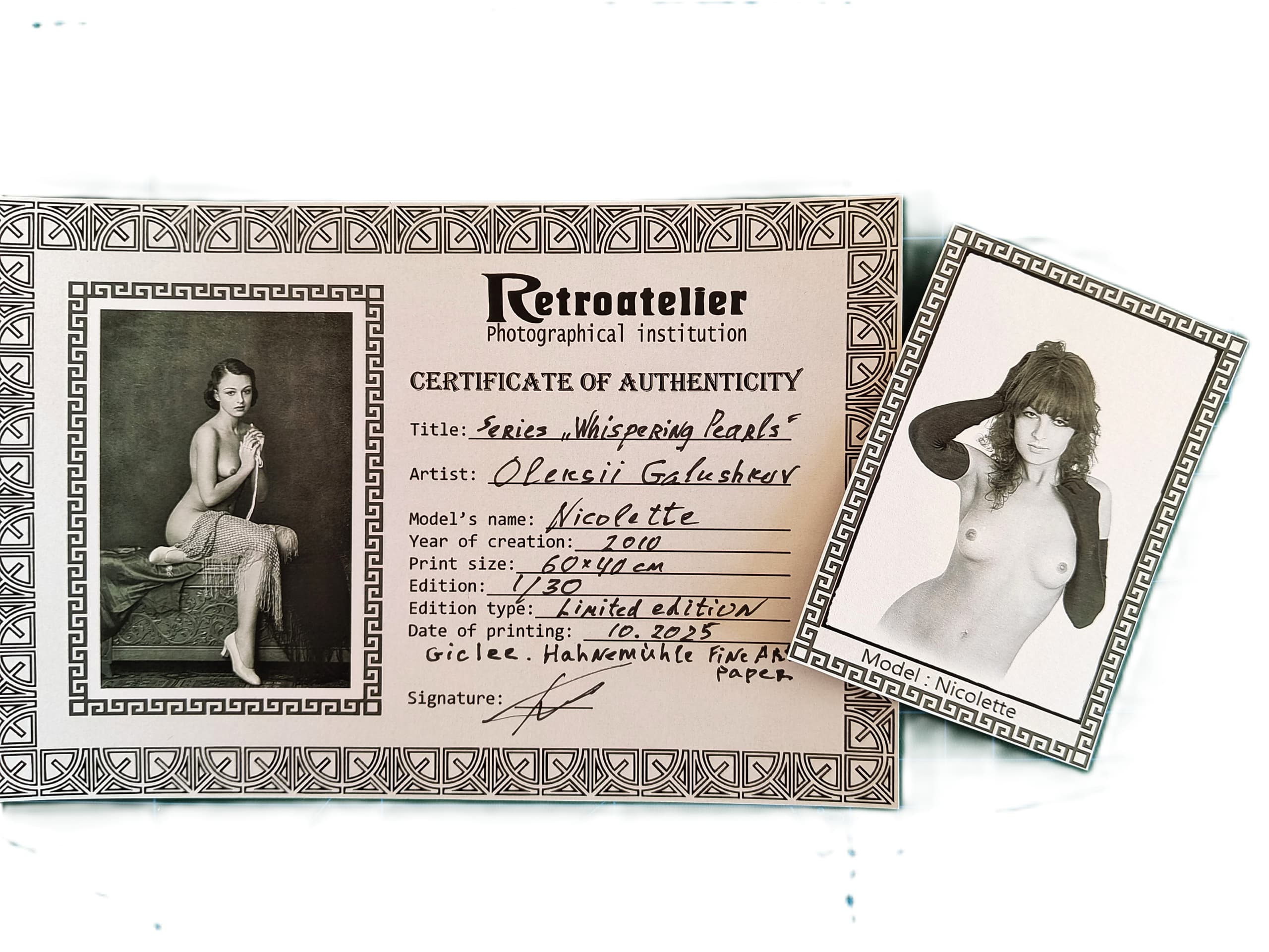 Elegant fine art giclée print from the RetroAtelier studio series, inspired by the refined sensuality of the 1930s. This work celebrates timeless feminine grace through the distinctive lens of Art Deco aesthetics.